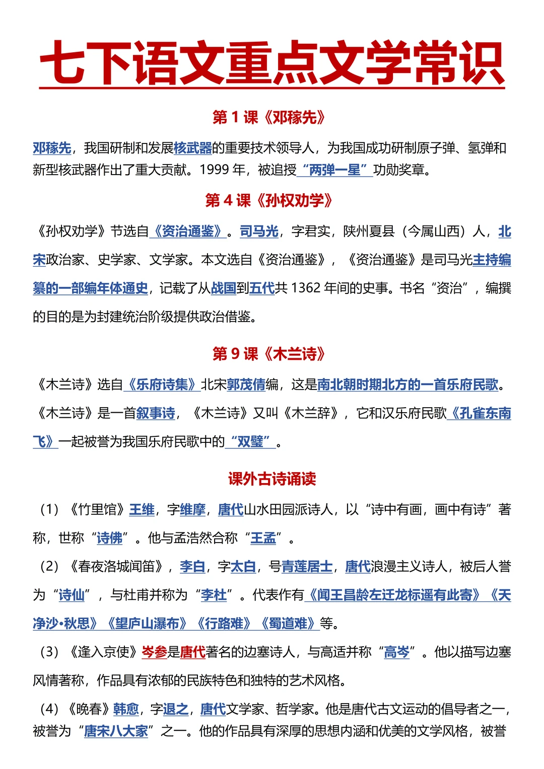 默写《孙权劝学》《木兰诗》的课下注释、全文翻译和专题资料里的重点字词、句子翻译;学习文言文断句、翻译方法,完成文言文阅读真题,整理内容理解题答题思路,提升文言文阅读能力。
