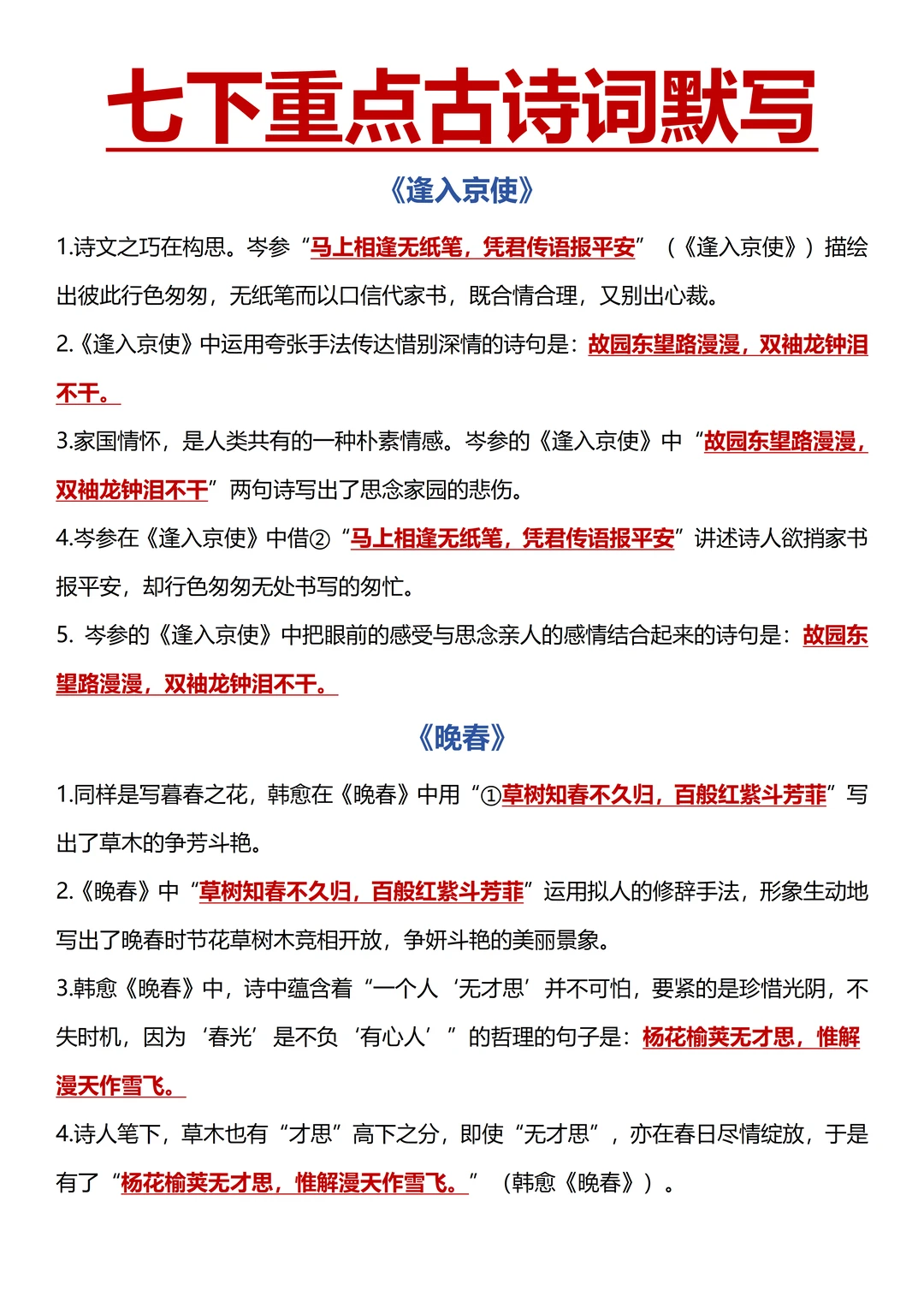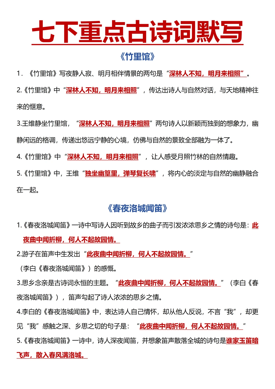 把《竹里馆》、《春夜洛城闻笛》、《逢入京使》、《晚春》的原文、翻译、主旨情感背熟,完成专题资料里的直接性和理解性默写;背熟古诗鉴赏答题公式,然后去做课内、课外古诗鉴赏,锻炼实战能力。