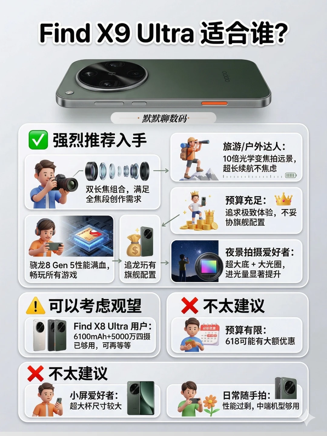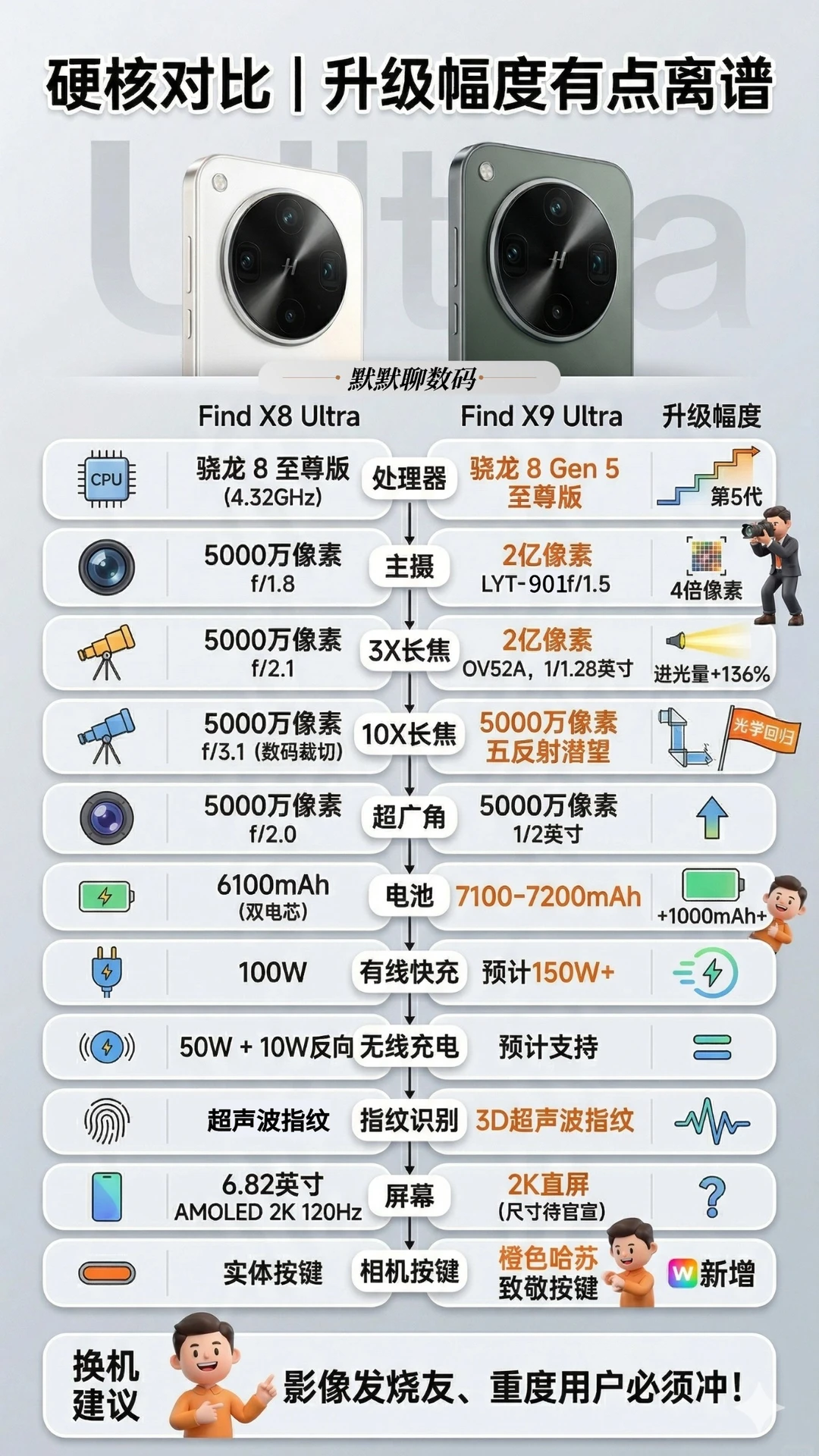 OPPO Find X9 Ultra 爆料来了🔥 看完最新的爆料信息,只能说OPPO这次是认真的,直接把参数继续往上堆😲 如果你手持X8 Ultra且不是极限拍摄党,倒也不是必须换代,毕竟6100mAh+5000万四摄的配置也够用了。 大家怎么看❓这波升级值不值❓ 📍参数全部来自官方预热 + 行业爆料汇总,建议⭐对比再决定!