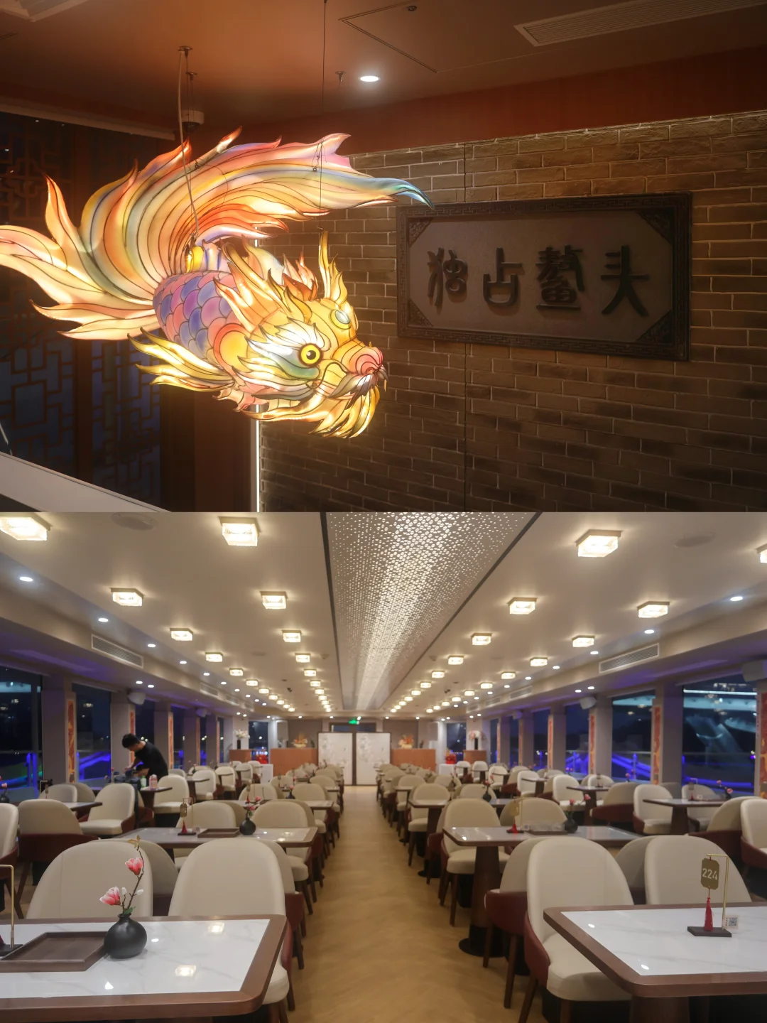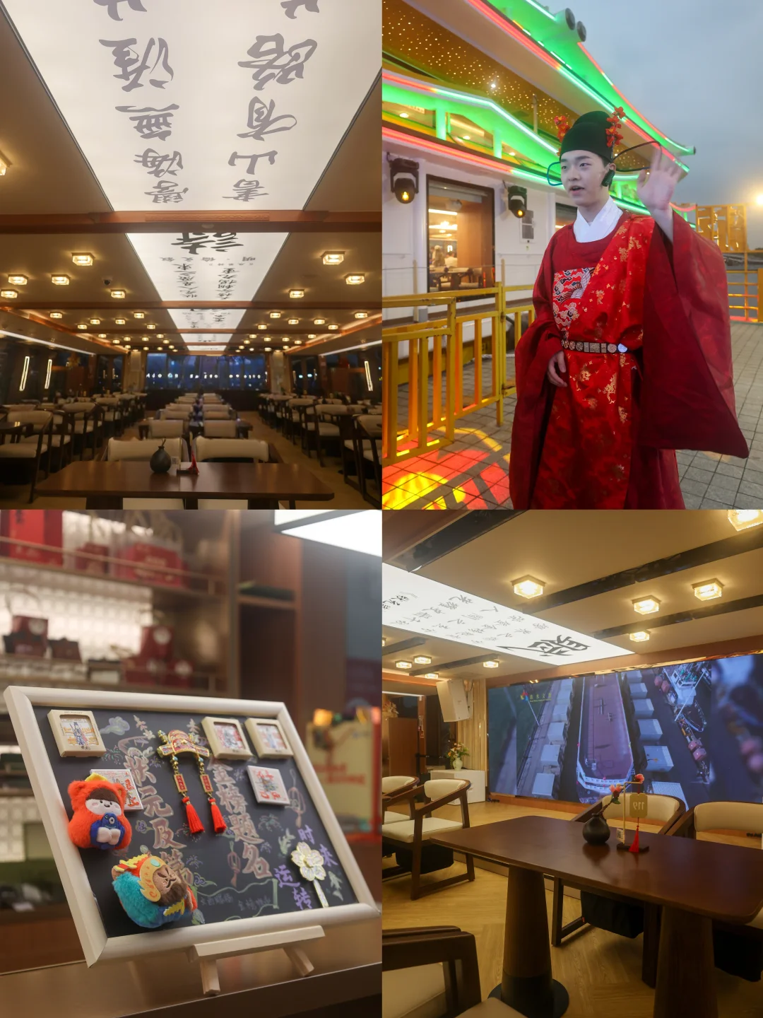 一进门就被震撼,头顶是巨型书法卷轴天花,暖黄灯光洒落,仿佛置身古代书院。找个位置坐下,喝一杯温热清茶,听工作人员讲解乘船须知,静静等待开船,惬意又安心
