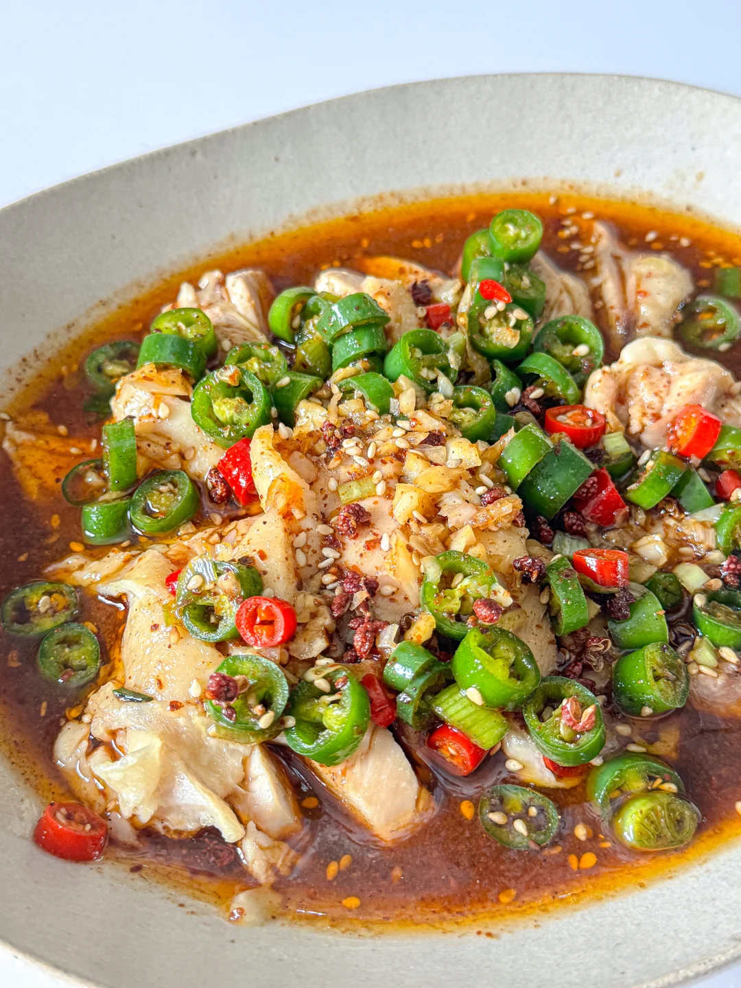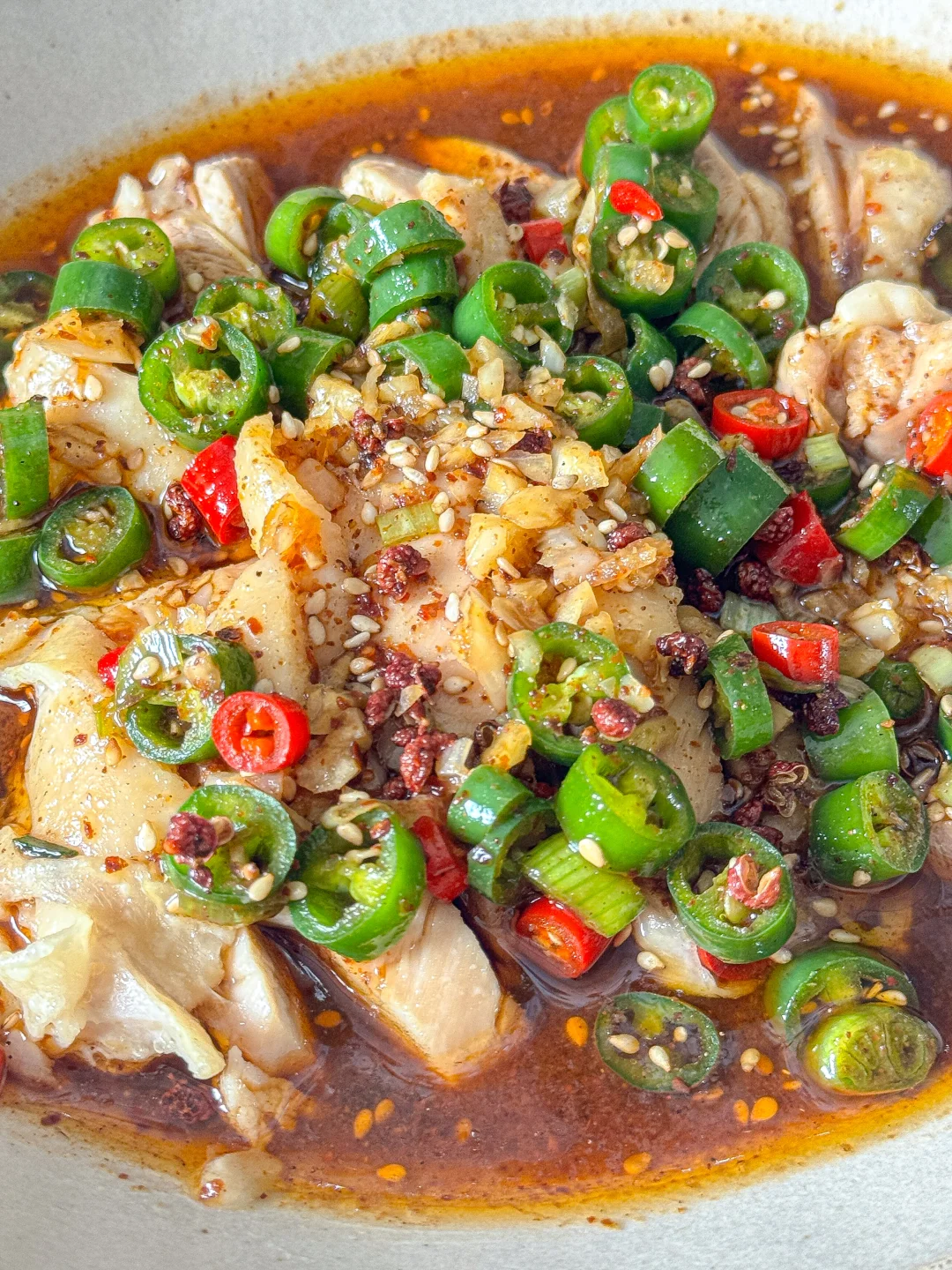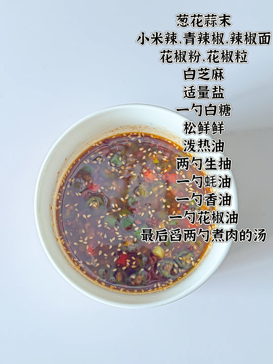 4️⃣ 一勺香油、一勺花椒油,最后加两勺煮肉的汤