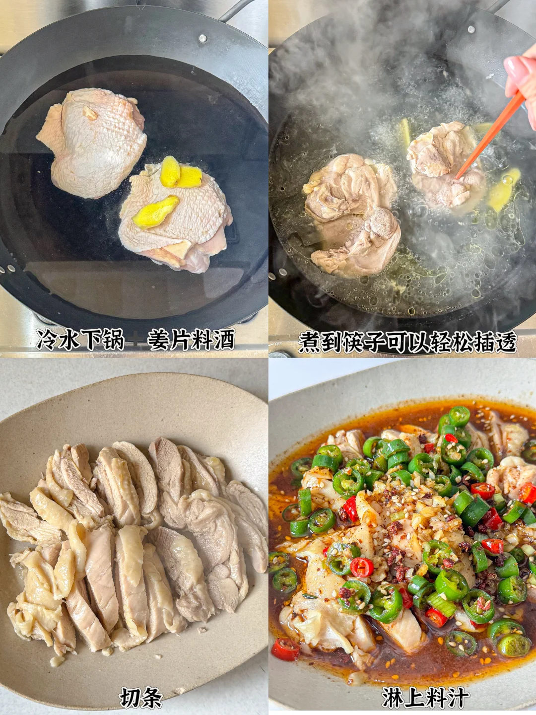 1️⃣ 鸡腿冷水下锅,加姜片、料酒煮到筷子轻松插透