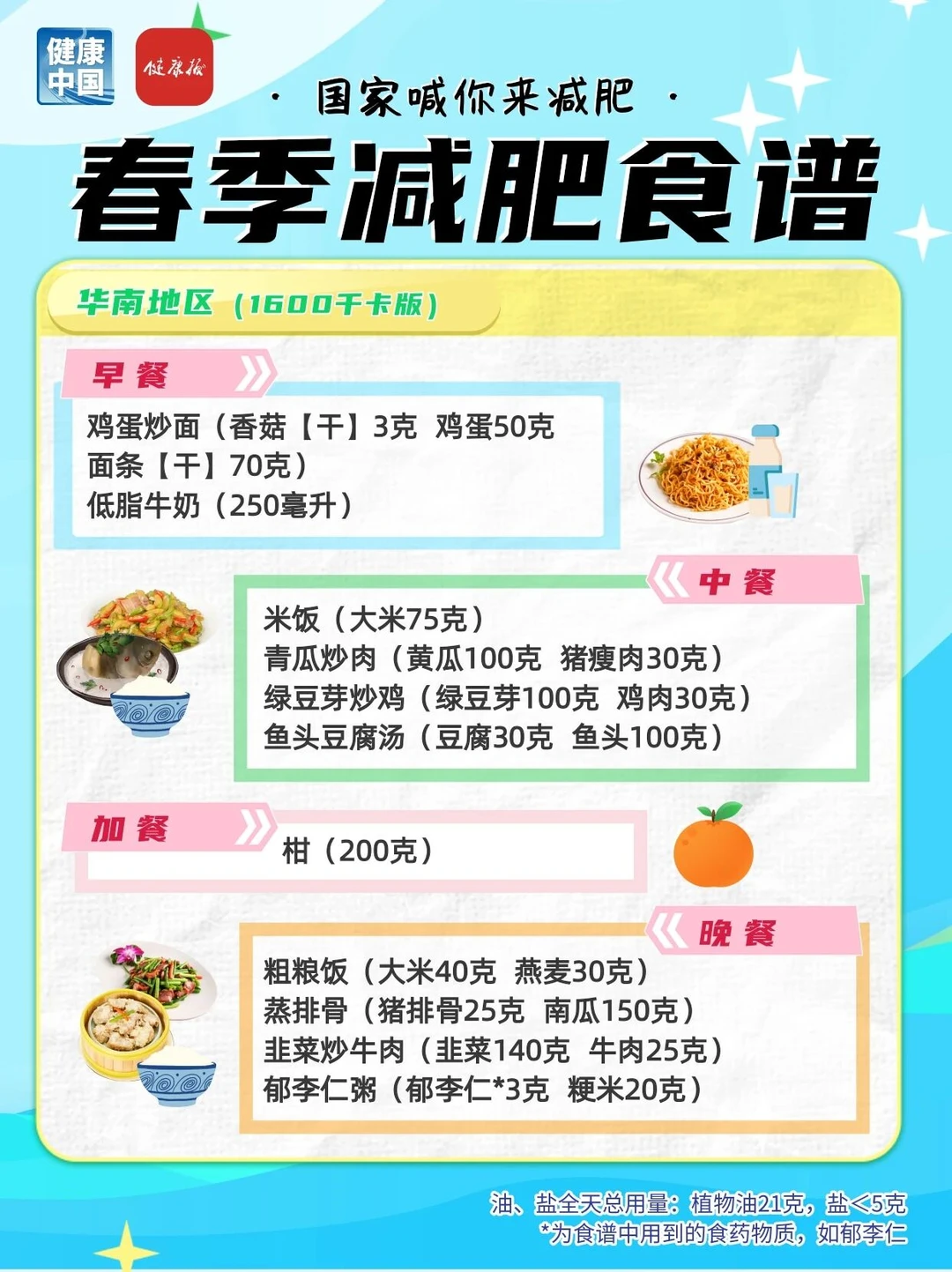 《成人肥胖食养指南(2024年版)》来了 针对不同地区/季节/热量需求设计 1200千卡/1400千卡/1600千卡三个等级任选 除特殊标明外,所有食材按可食部生重计算 华南地区食谱特色: ✔️主食爱吃大米?粗细搭配更健康! ✔️每日煲汤习惯?低脂汤方照样鲜美 ✔️海鲜水产丰富?清蒸保留原味