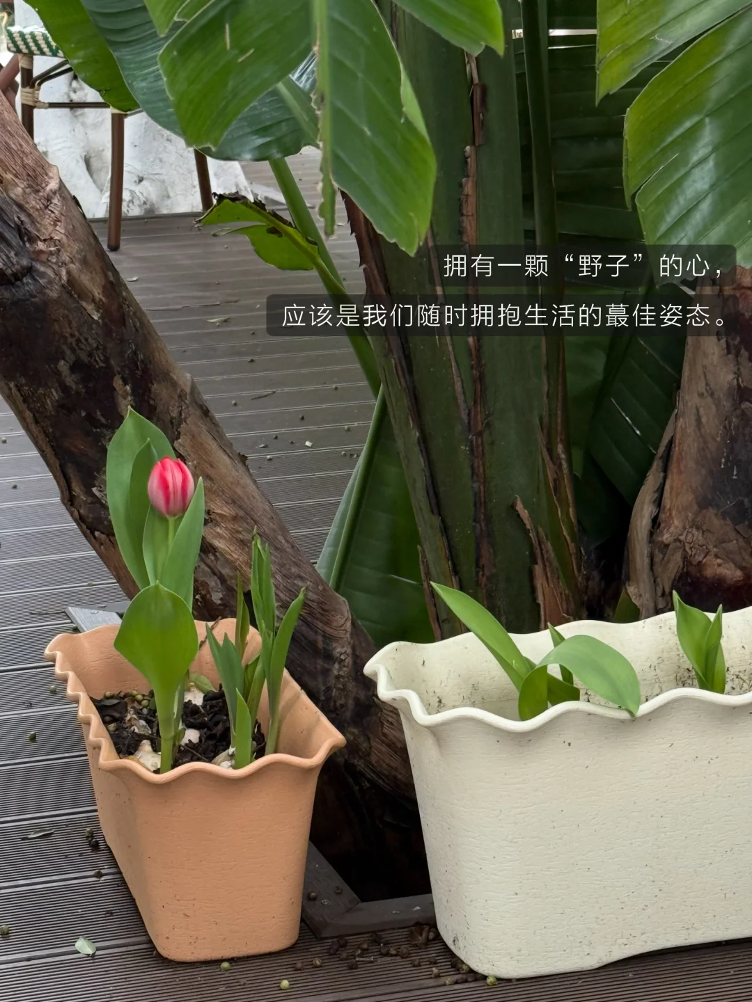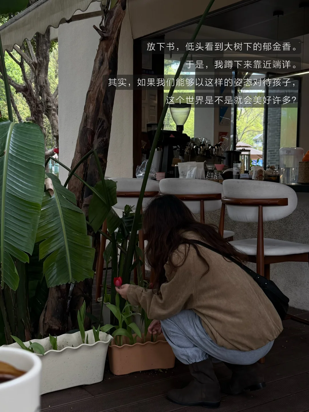 放下书,低头看到大树下的郁金香。于是,我蹲下来靠近端详。其实,如果我们能够以这样的姿态对待孩子,这个世界是不是就会美好许多?