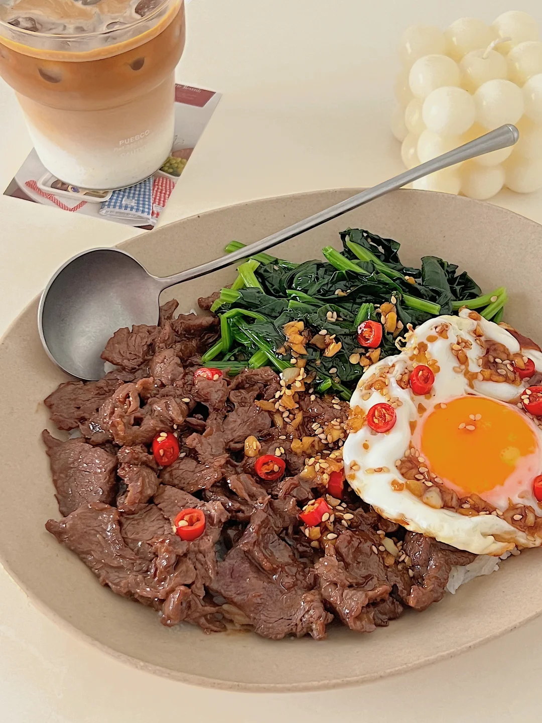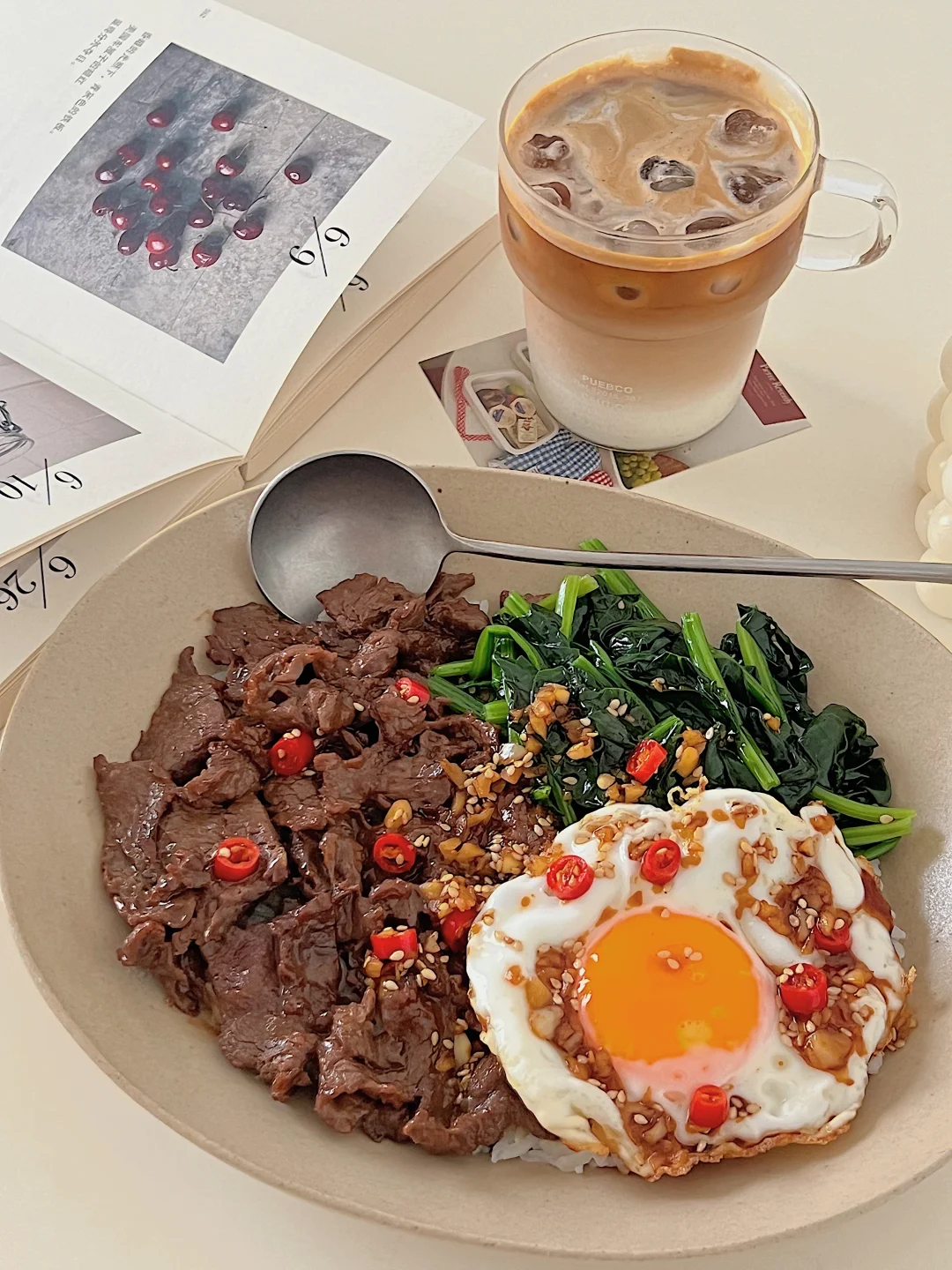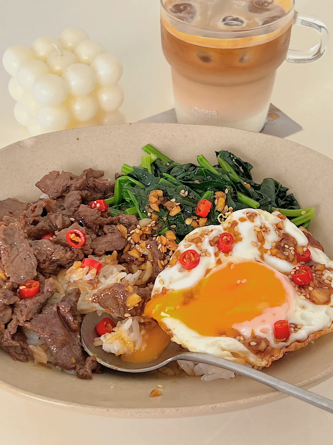 6️⃣ 米饭铺底,码上牛肉、菠菜、流心蛋,淋入酱汁拌匀开吃!