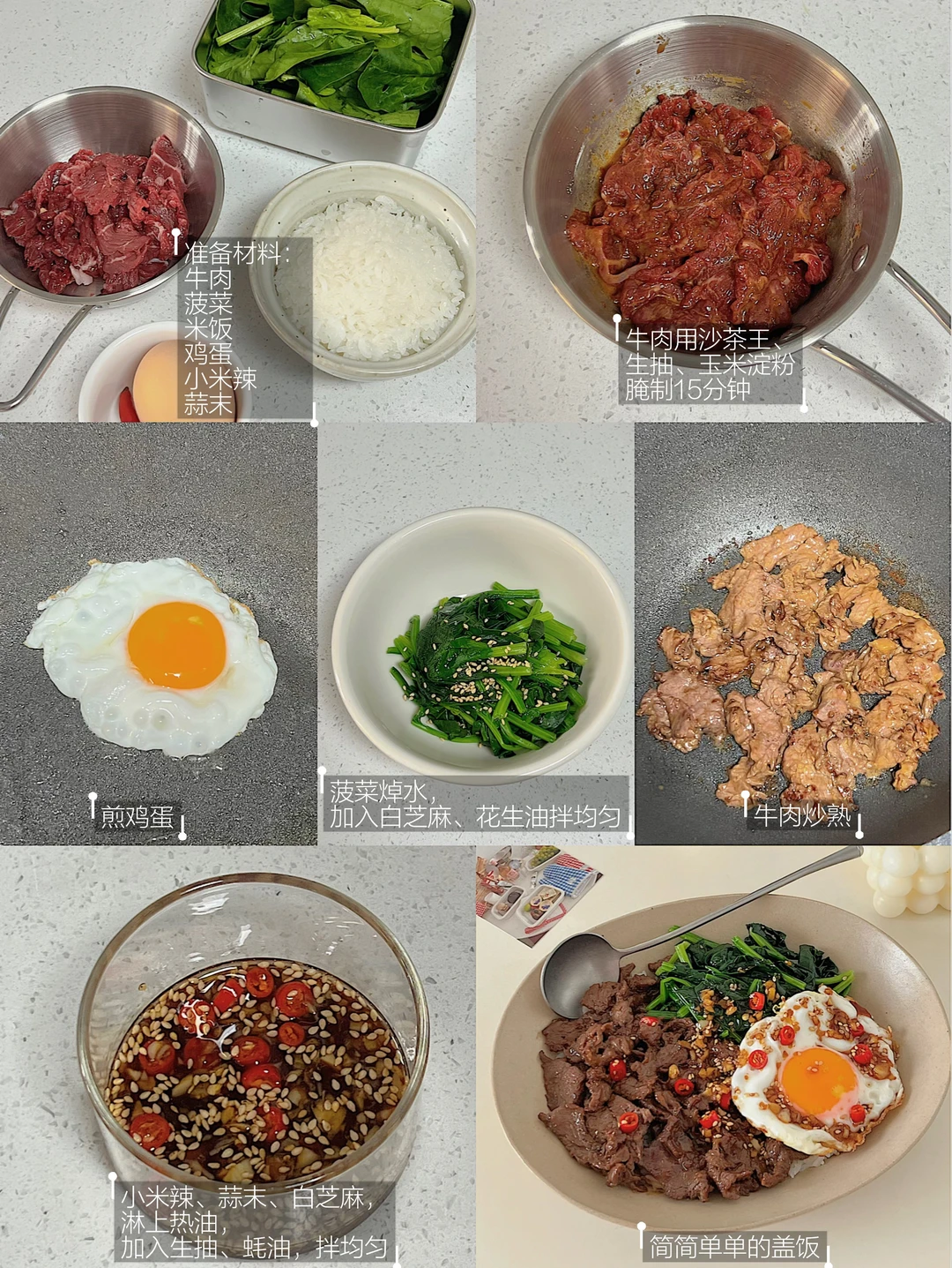 牛肉片|菠菜|鸡蛋|小米辣|蒜末|米饭