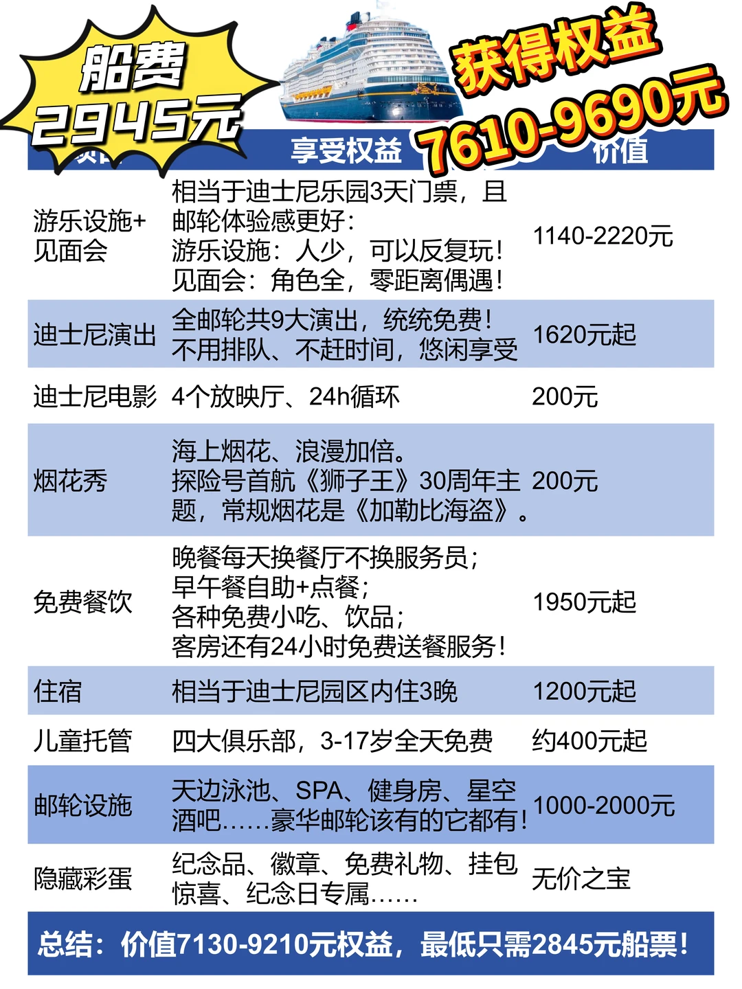 去完首航发现:迪士尼探索号邮轮简直就是羊毛党天堂! [星R]最低不到3000元=4天3晚超豪华邮轮! [星R]一价全包,吃、住、玩统统免费!权益价值近万元! [星R]各种隐藏福利,证书、徽章、吊饰、礼物……不花一分钱收获满满。 干货太多,正文只帮大家算明白账。 怎么选房?上船怎么玩?隐藏福利[向右R]看图片 —— [一R]游乐设施+见面会[钱袋R]1140-2220元 港迪一日票380-740元,邮轮除去上下船、按3天算,价值1140-2220。 关键是‼️游轮人少、不会排长队,喜欢的项目可以反复玩(上迪每天平均5万人次、最高可达15万人,但邮轮最多只容纳9000多人。) 见面会更爽:集合全球迪士尼经典,各种偶遇,跟史努比一起坐电梯! [二R]九大演出[钱袋R]1620起 迪士尼剧院演出180、灯光秀299,百老汇狮子王音乐剧最低1000——邮轮有9大演出,按最低价180一场,总价值也超过1620。 [三R]电影24h循环[钱袋R]200元 4个放映厅分别是神奇四侠、大白、Tron Ares战神、疯狂动物城2,按每场50元算。 [四R]海上烟花[钱袋R]约200元 浏阳烟花秀128起,天空剧场498起、VIP1280起。 迪士尼邮轮是海上烟花、有经典电影主题,浪漫加倍。 [五R]餐饮全免费[钱袋R]1950起 参考迪士尼园区,3顿晚餐按300/人,早中餐各150/人,4天3晚就是1950,还不算全天候提供的各种免费小吃、饮品…… [六R]3晚住宿[钱袋R]1200起 按园区内住宿,400一晚妥妥地板价。 [七R]3-17岁免费托管[钱袋R]约300元 市场价20-80/h,迪士尼邮轮有四个儿童俱乐部,全天免费托管。 [八R]其它邮轮设施[钱袋R]1000-2000元 无边泳池、SPA、健身房、星空酒吧……豪华邮轮该有的都有,还全免费! [九R]彩蛋:快乐无价⚠️一定看图 各种纪念品、下船时行李箱都超负荷。 ‼️总结划重点 只要登上迪士尼探索号,可享权益7610-9690元,而船票最低只需要2945元,这中间的差价足够买新加坡往返机票、再大肆shopping,简直抢到等于赚到! —— ✅️推荐直接在携程订票 ‼️3月31前有羊毛薅! 一个是之前定了首航但延期的,有5折补贴券,巨划算! 另外携程还有通用的500元券,夜市必须3.31前下单。 🔶价格和官网一样,但可以提前75天免费取消(官网是90天)。 🔶国内唯一官方直连的OTA,能在线选房、抢房不会崩。 🔶能改出行人,现在下单锁定好价、后面有变动也不怕。