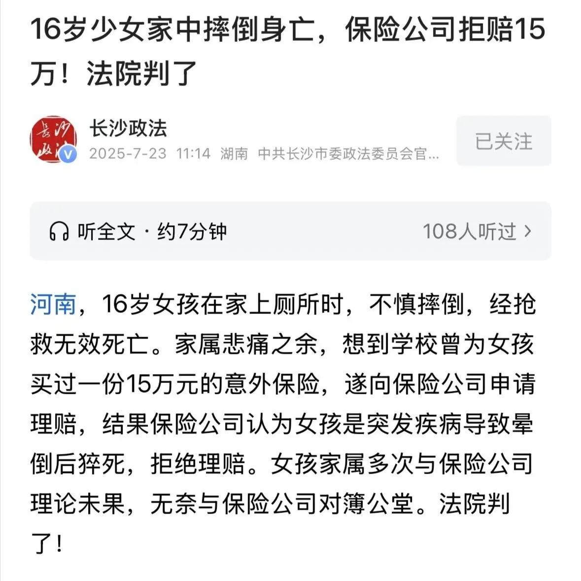 河南,16岁女孩在家上厕所时,不慎摔倒,经抢救无效死亡,家属悲痛之余,想到学校曾为女孩买过一份15万元的意外保险,遂向保险公司申请理赔,结果保险公司认为女孩是突发疾病导致晕倒后猝死,拒绝理赔,女孩家属多次与保险公司理论未果,无奈与保险公司对簿公堂,法院判了! 其实表面看就是一场保险纠纷,可总有点“这里头有门道”的意味。 说到底,这案子撞在了“意外”跟“疾病”这道槛上,该算哪一档,来回推拖了大半年。 孩子才16岁,正在等着高考,身体一直好好的,学校体检表年年交,没一点毛病。 这事发生在2024年,就在家,那天原本没啥风浪,谁又能料到一转头竟然成了生离死别? 那天女孩从厕所出来,刚推开门,脚下一滑,被门口半截挡水石绊了,身子一歪,重重摔倒在瓷砖上,人一下就昏了过去。 家里人当场吓瘫,第一反应是直接把床单撕了就抬人,打120,结果几分钟不到医护上门后,家里人急得话都说不利索。 心肺复苏做了快一个小时,还是没救过来。 后来医院开出死亡证明件,白纸黑字写得清楚:摔倒、呼吸心跳骤停。 家属还不死心,又把学校的历年体检单翻出来,生怕医学上有“遗漏”。 无论怎么证明,女孩就这样定格在了16岁的夏天。 丧事还没忙完,家属就想起了那份学校配的意外险,说到底,谁也没多想,本就是场意外。 材料一递交,保险公司那边一下绷紧了脸,说这不是传统意义上的意外,而是身体自个儿出毛病猝死的,这一招硬生生把赔付打了个对折。 这心思,多数投保人一听火就上来了。 保险合同签得死板贴心,理赔的时候层层加码,谁受得了这样的事? 保险公司让家属开什么“无刑事案件证明”,家里人照办了,跑警察局,填表子查材料,公安还专门查了案,最后书面写得明明白白,不涉及刑事犯罪,不走司法程序。 再按理说,到这步保险应该认账。 没想到,保险公司继续添油加醋,让提供尸检报告。 老人听了差点当场撕了凳子,年轻人一肚子火气,大家心里的委屈已经装不下了。 法院根据现行《保险法》和司法判例,关键就一句话:到底啥引起的死亡? 只要“摔倒”这个外来的突发因素是直接原因,就算后头心脏不跳,也不能说成是自招疾病。保险公司主观猜测没根据,只想把赔付风险撇干净。 一审法官坐在那,翻完所有证据,发现死亡证明、急救记录、体检报告等都搭好了完整的证据链,家属这边举证已经没什么毛病。 保险公司这边却没人能说出,女孩到底有啥病让她这么突然晕倒,还接着说成猝死。 结果一听判决,保险公司不服,二审又一路上了中院。 到终审,判决清楚说了,猝死只是一种表现形式,不等同于死因。 保险公司想拿模糊概念混淆黑白,不可能让家属承担只能靠开棺验尸的“无底线”证明压力,近因是摔倒,责任得负,15万必须赔。 裁定书一出,这事终于划上句号,也算还了已经安息的女孩一个交代。 一份判决书,牵动的其实不止一个家庭的情感,还有整个行业的诚信。 保险公司这么“宽进严出”捣腾理赔,要是人人学着这么玩,意外险的底气早晚被掏空。 投保人要的是信任,保险公司玩的却是机关算尽。这股子操作劲头,老百姓哪能没情绪? 这案子的最后,判决意义尤其大,保险公司如果想免责,得真凭实据,而不是习惯性把死亡归到最模糊那一档。 对保险行业来说,这是一次警示:诚信和契约才是真正的商业根本。 15万赔款,对一个刚刚送走女儿的家庭来说,确实远远不够弥补心头之痛,但这份官司的结果,是用来给逝者一个说法,也是为后面无数个投保人提了醒。