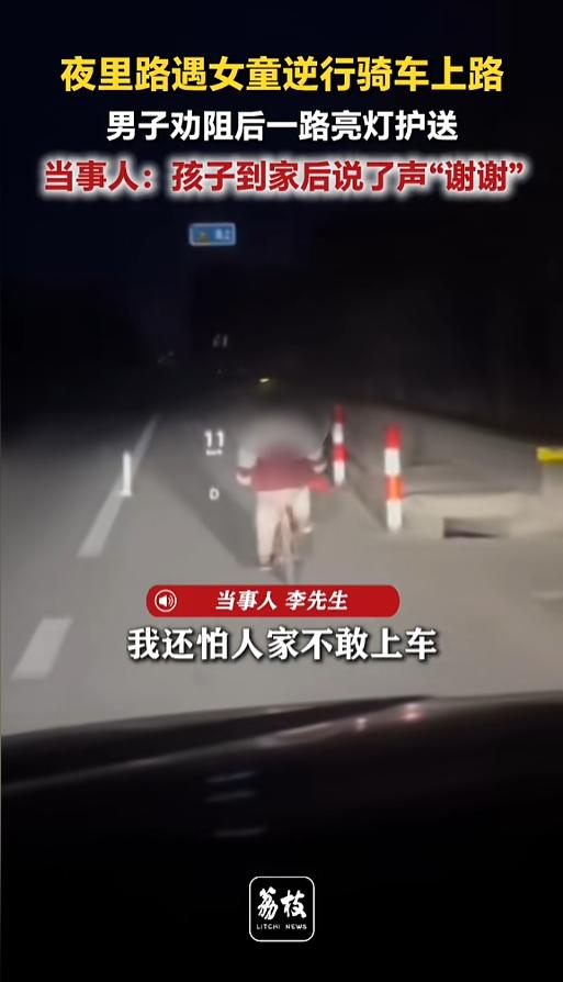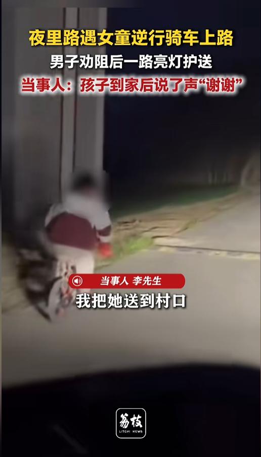 “幸亏是个好人!”3月28日,河北衡水,一位司机天黑时路过料场,发现有个小女孩在独自骑车,这条路大货车很多,司机本想开车把她送回去,但又担心孩子害怕,就一路开灯护送,直到她到了家门口!网友:家里人心太大了! 孩子太小,晚上千万不能让他一个人出门,一方面怕遇到坏人,另一方面,路上车来车往,本身也很不安全。 这天晚上,天已经黑了,李先生开车路过了一个料场,看见一个小女孩独自骑着自行车,还是在路上逆行。这条路上平时拉料的大货车很多,也没有路灯,光线很暗。小女孩看起来也就六七岁,还没有大货车轮子高,看着就很不安全。 李先生本来打算直接把小女孩给送回去,但又转念一想,自己一个陌生人,再吓着小女孩,不敢上车咋办。于是他就换了个思路,喊话让小女孩靠边慢慢走,自己在后面开着灯跟着。 李先生就这么慢慢的跟着,一直把她送到了村口,看着她骑到了家门口,自己才离开。临走的时候,小女孩还跟他说了声谢谢呢! 网友看后表示,幸亏司机是个好人,护送了小女孩一路,不然这危险的环境下,指不定出什么事故呢! 不过,各位家长朋友们,千万不要让自己的孩子,晚上独自出去,哪怕再近的路也不行,一定要有大人陪着。防人之心不可无,可不能让孩子落入危险的环境里! 信息来源:《