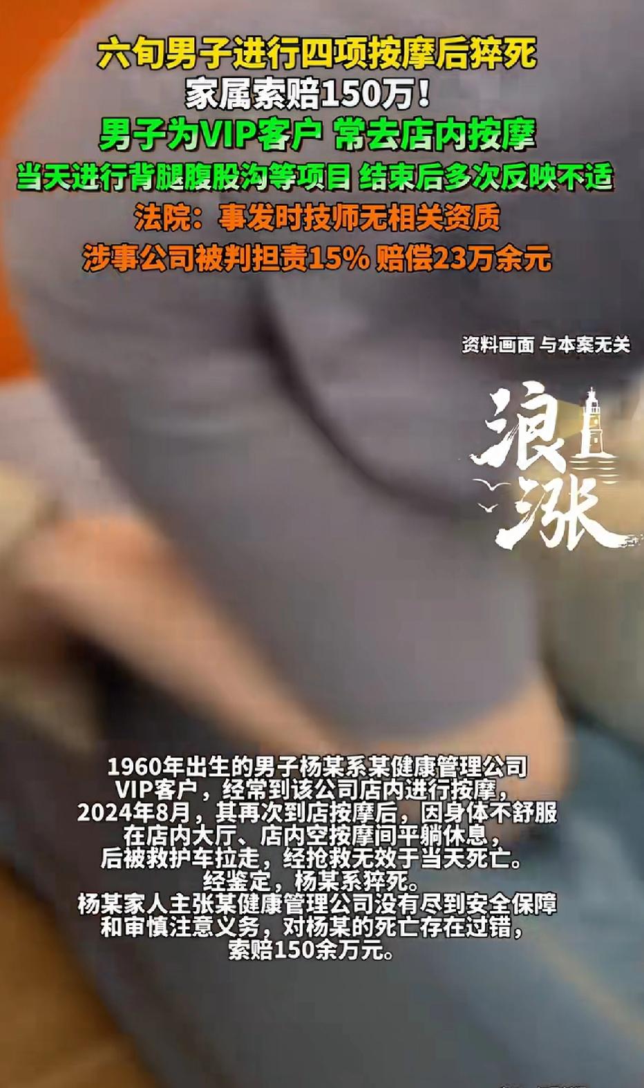 六旬男子进行四项按摩后猝死,家属索赔150万。男子为VIP客户常去店内按摩。当天进行背腿腹股沟项目,结束后多次反映不适,法院:事发时技师无相关资质,涉事公司被判担责15%赔偿23万余元。 六旬男子杨某作为健康管理公司的VIP,常去店内按摩。2024年8月,他进行四项按摩后身体不适,在店内休息后被送医,最终猝死。家属索赔150万,理由是公司没尽到安全保障和审慎注意义务。 一审法院认定,杨某自身承担85%责任,因技师无资质、公司未尽安全保障义务,公司担15%责任,赔23万余元。公司不服上诉,二审维持原判。 类似的,贵州一男子何某在养生馆按摩后猝死,家属索赔140万,法院因死亡系自身疾病导致,驳回诉求。看来遇到这类事,责任认定还得看具体情况。