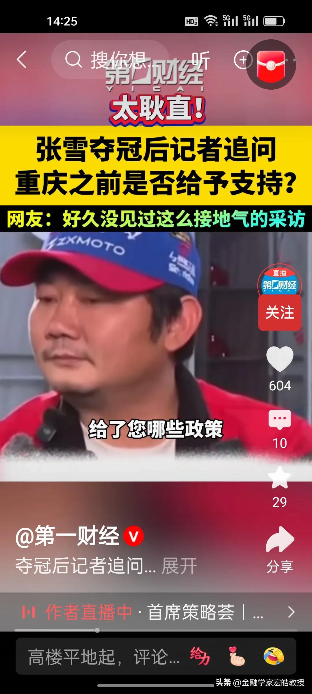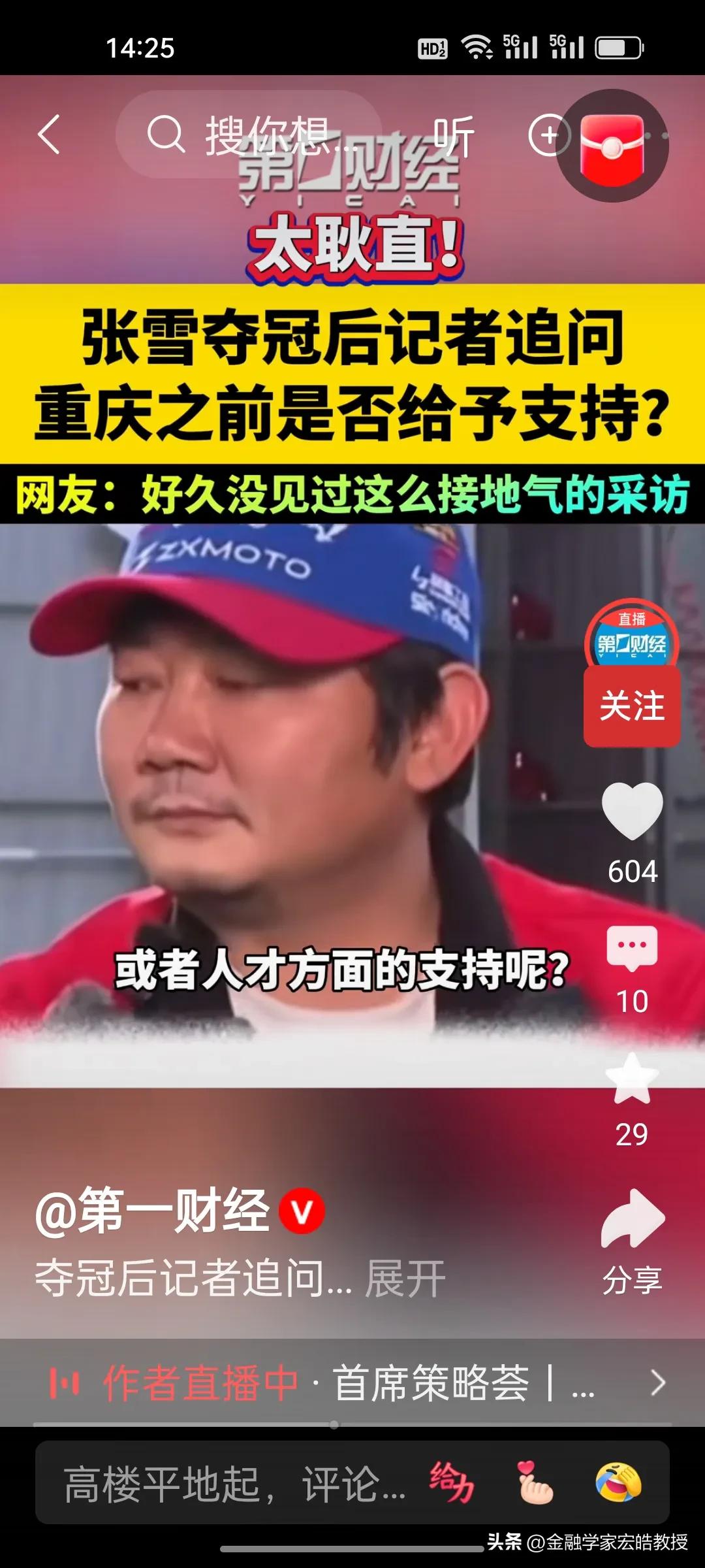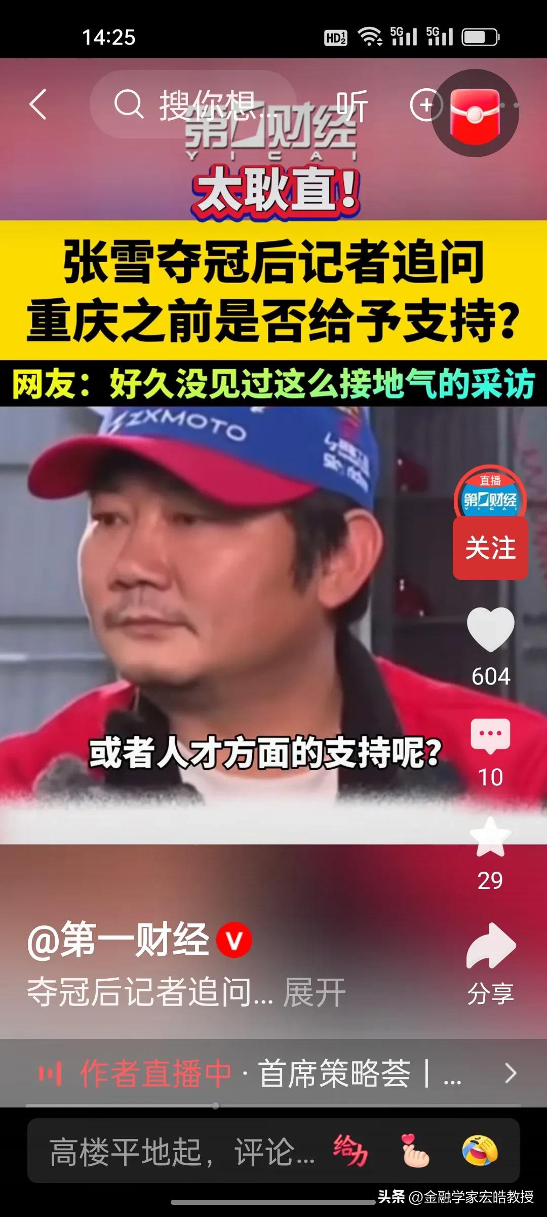 张雪真的太实诚!刚刚看到《第一财经》的一个视频中,记者追着问张雪:“咱们重庆给了您哪些政策、人才支持?” 张雪愣了一下,直接实话实说:“我说真的吗?没有,一个子都没有!” 没有场面话,没有假大空,没有把功劳往地方上靠,就这么一句大实话,直接戳中了所有创业者的心声。 2013年,26岁的张雪揣着2万块钱只身闯重庆,没有厂房、没有团队、没有人脉,全靠一身技术在论坛接改装单起步。从修车学徒到世界冠军,从凯越机车到WSBK双冠王,他用13年时间,把中国摩托干到了世界之巅。 他靠的从来不是什么政策扶持,而是自己在油污里摸爬滚打、在赛道上摔了又爬起来的死磕。 值得一提的是,浙江国资早在张雪夺冠前3个月,用9000万精准押注了这位“靠自己拼出来的世界冠军”,赚足了口碑,完美踩中了中国摩托崛起的风口。 当然,我敢说,这次WSBK双冠之后,重庆绝对会给张雪、给中国摩托产业,补上最实在的政策支持。毕竟,这样靠自己拼出来的世界冠军,才是最值得被托举的底气!