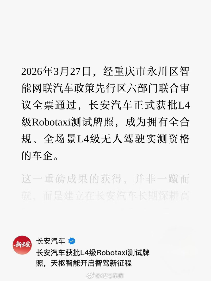 刚刚,长安汽车宣布,已于 3 月 27 日获得 L4 级 Robotaxi 测试牌照