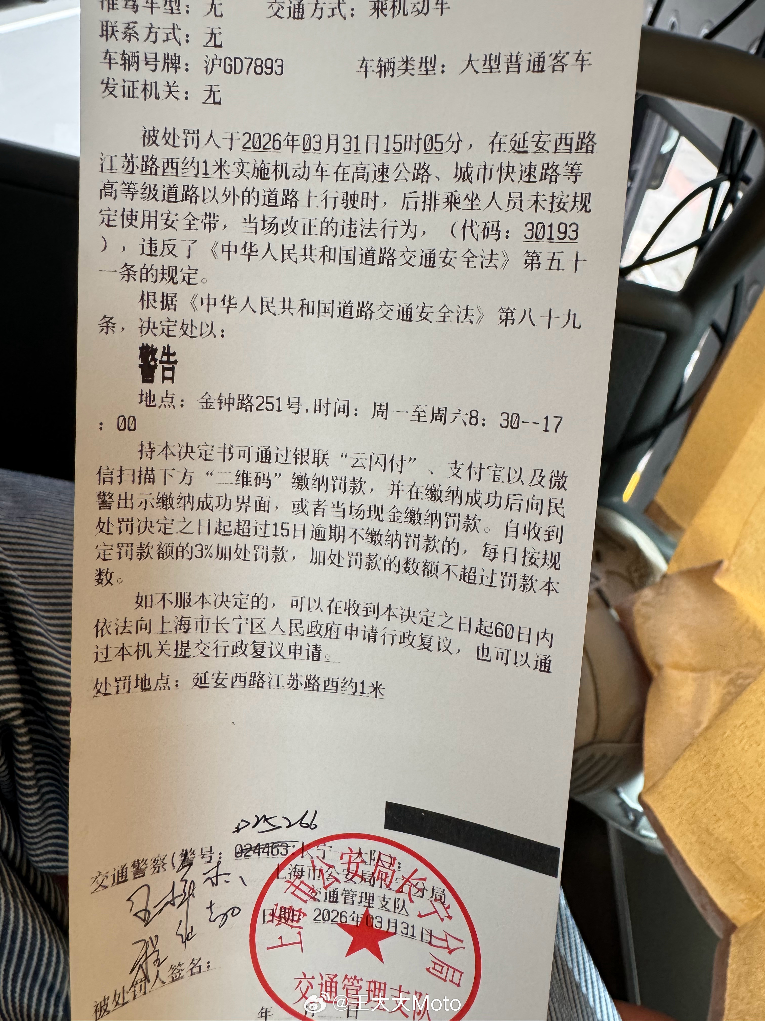 在上海,坐大巴领罚单了理由是后排乘客没系安全带