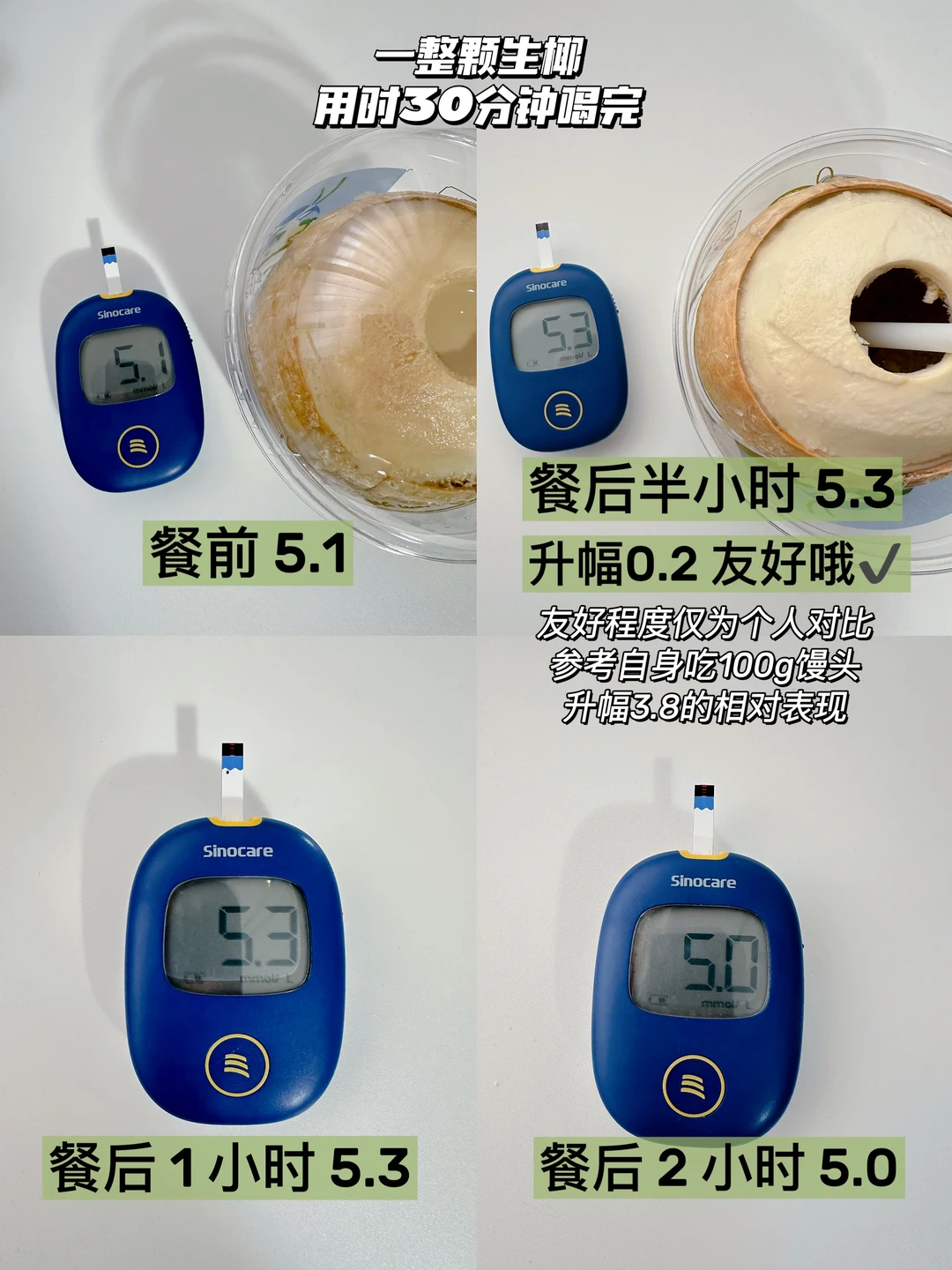 液体部分测出来升糖情况很友好,默认微甜的甜度会有点偏甜,比生椰拿铁更清甜一些,可以先喝一点然后往里面加水或奶,毕竟这个“容器”很特别,多用一会儿是一会儿[大笑R]