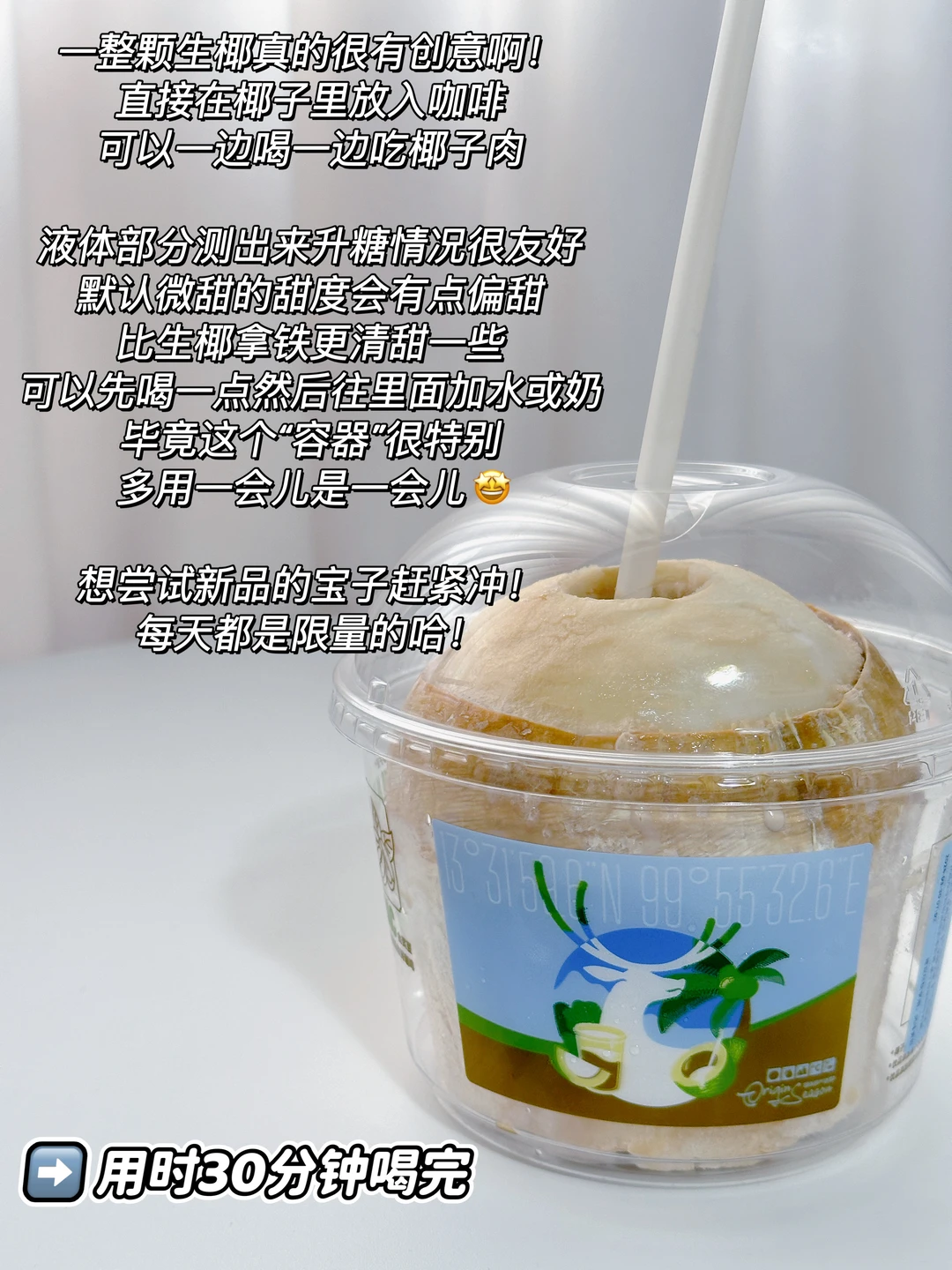 一整颗生椰真的很有创意啊!直接在椰子里放入咖啡,可以一边喝一边吃椰子肉🥥