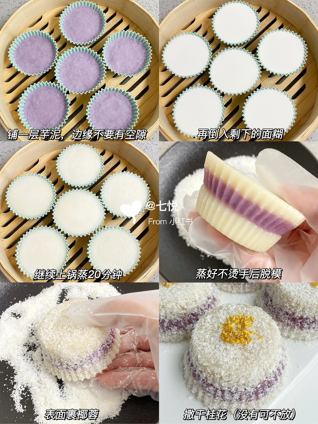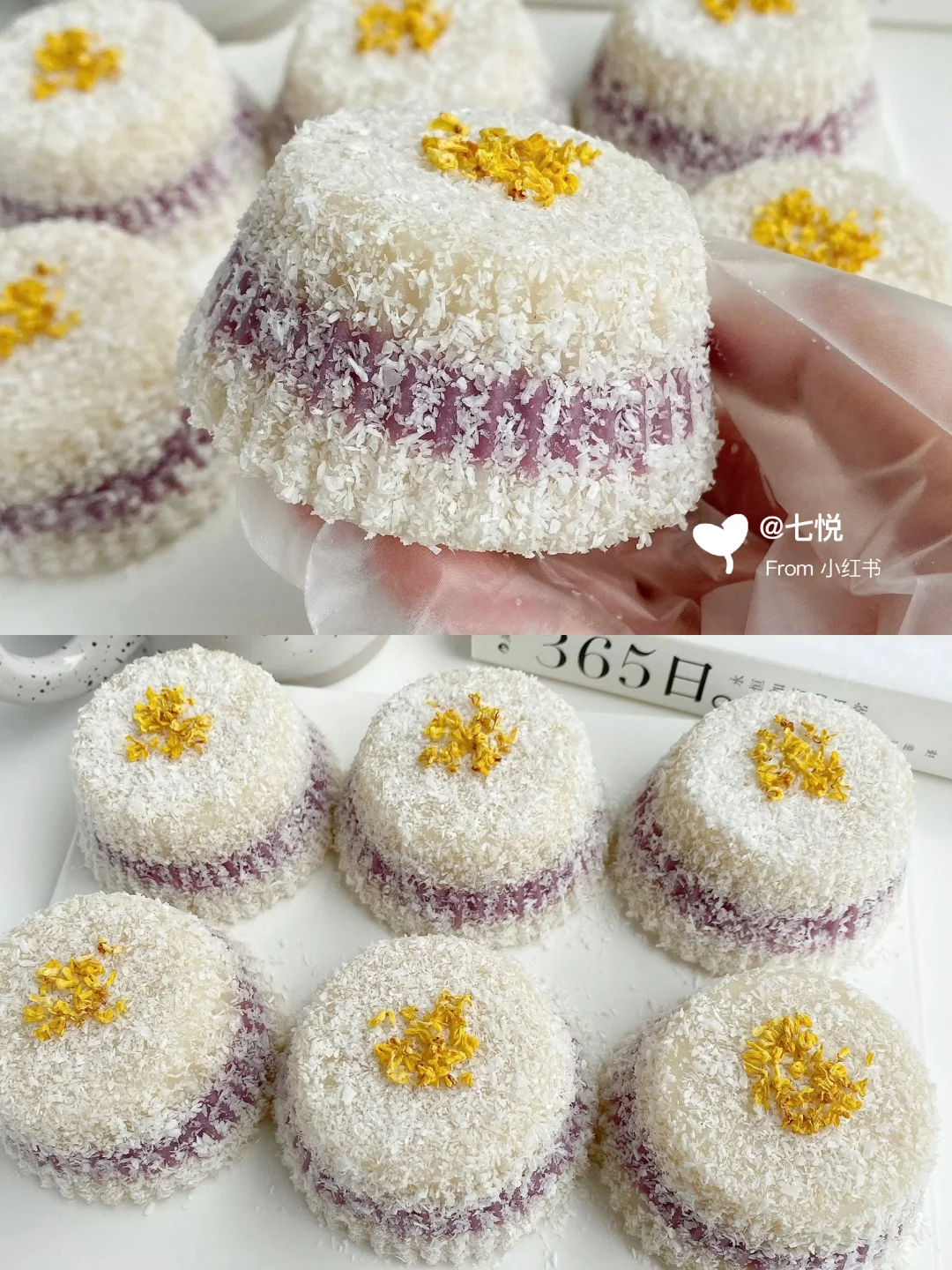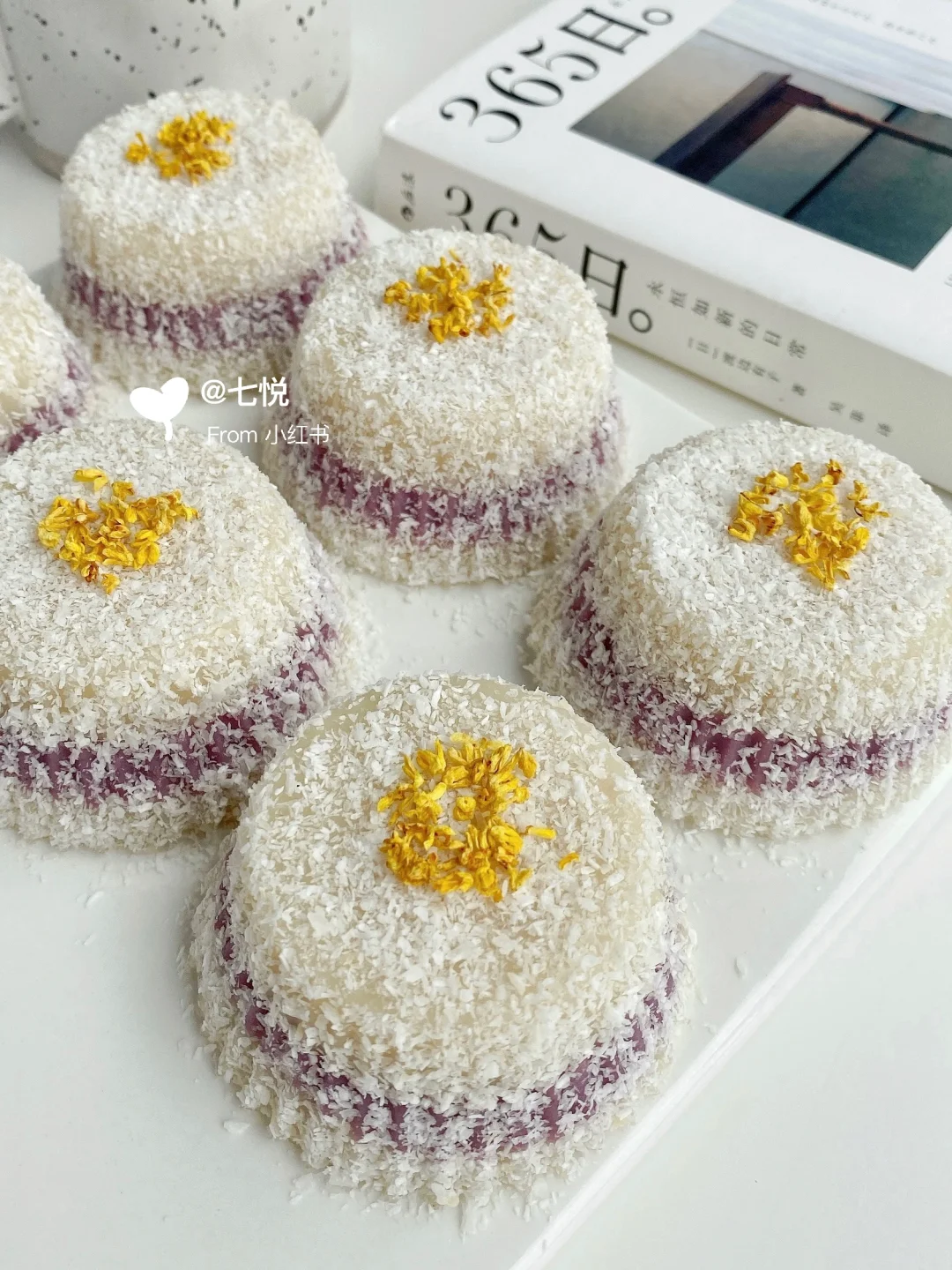 4️⃣蒸好不烫手后脱模,表面裹椰蓉,撒少许干桂花(没有可不放)