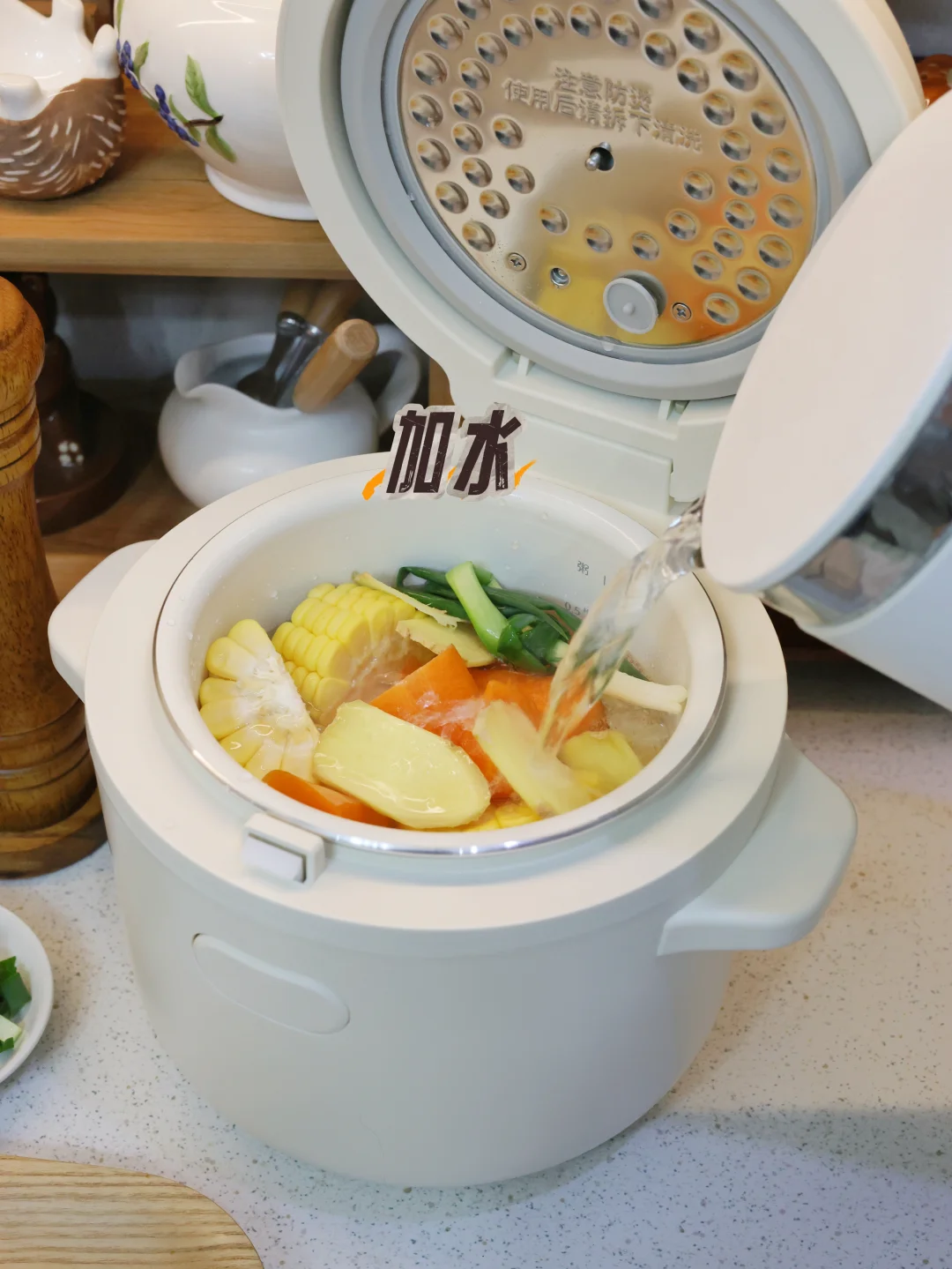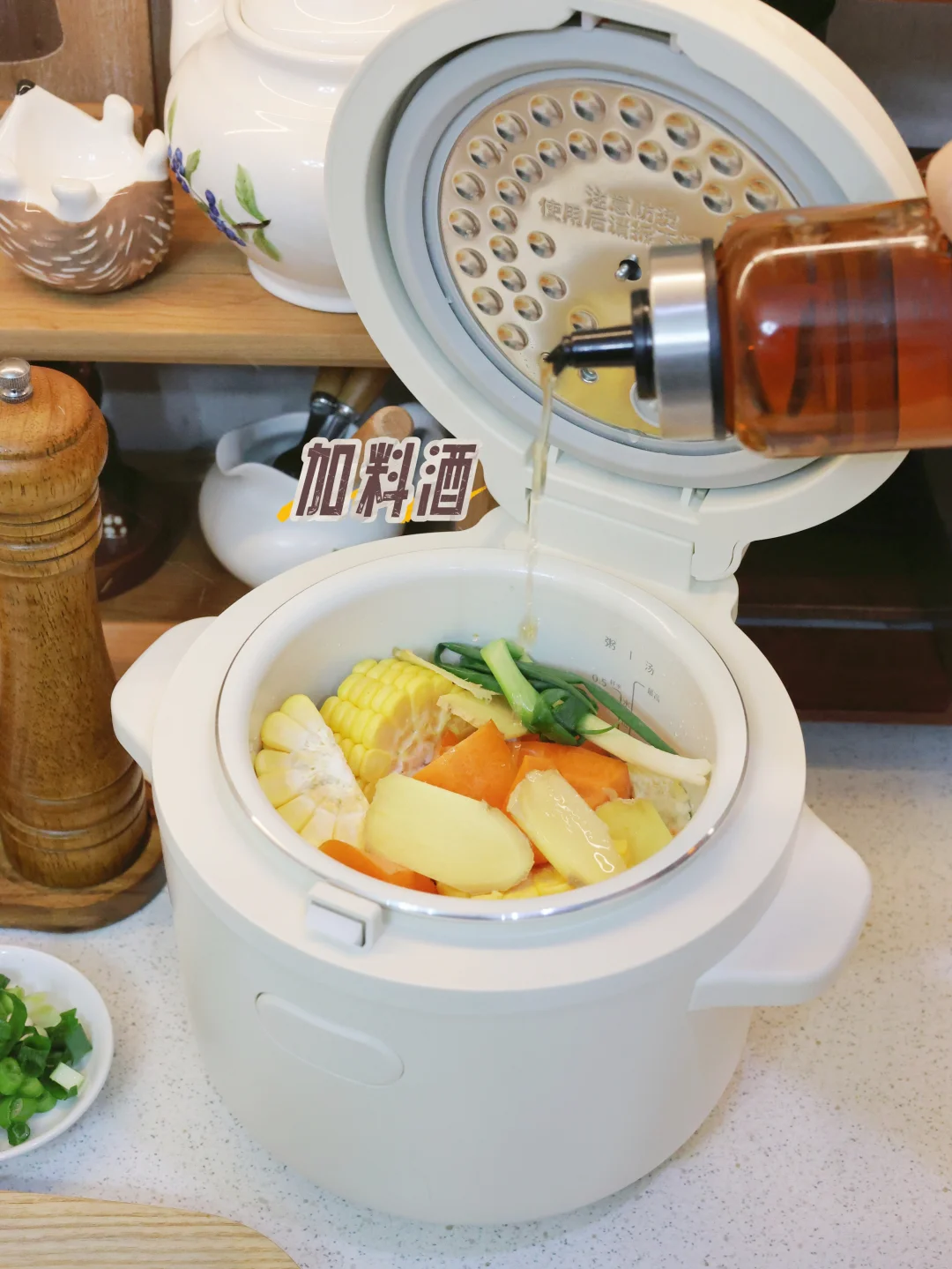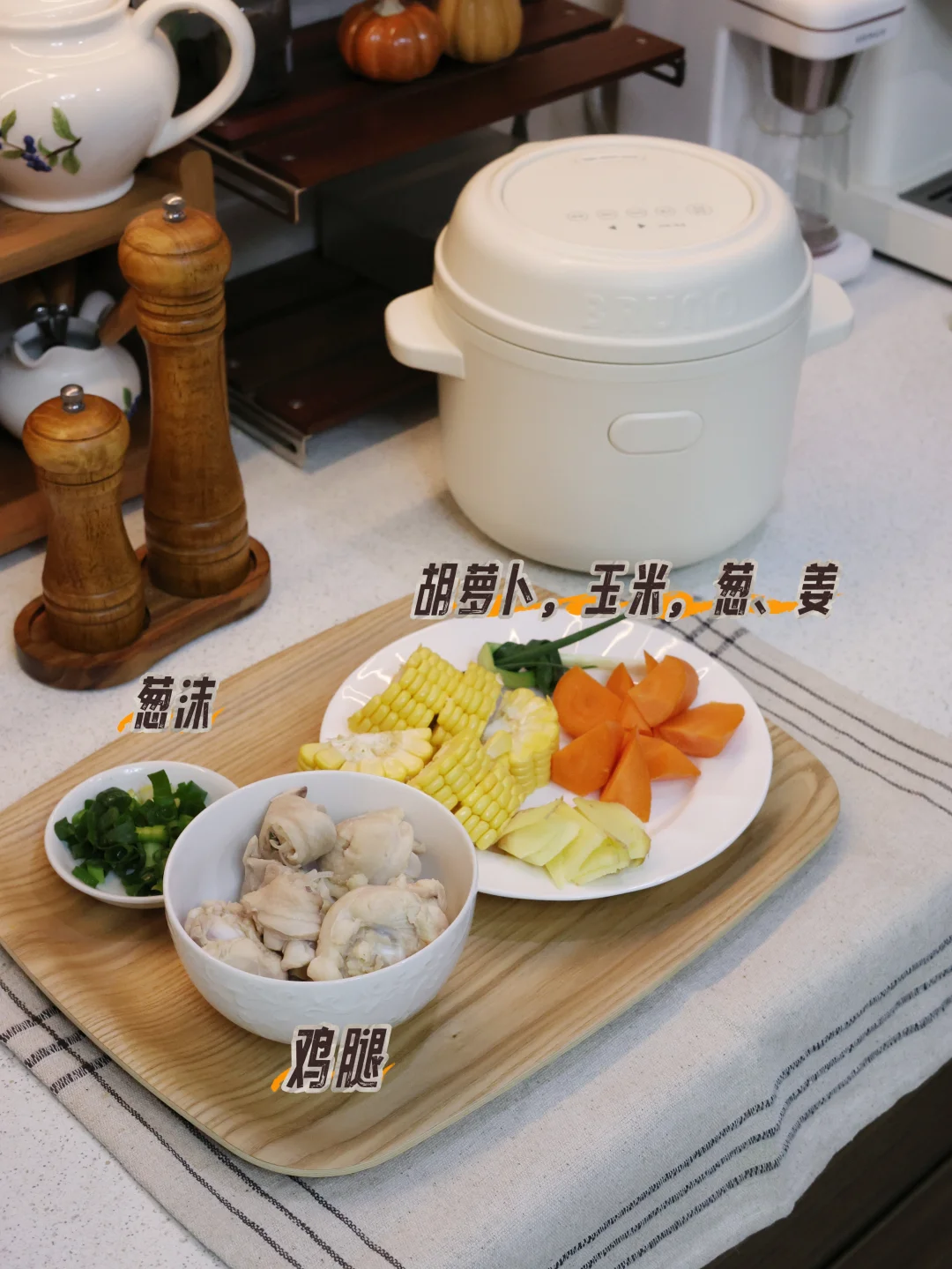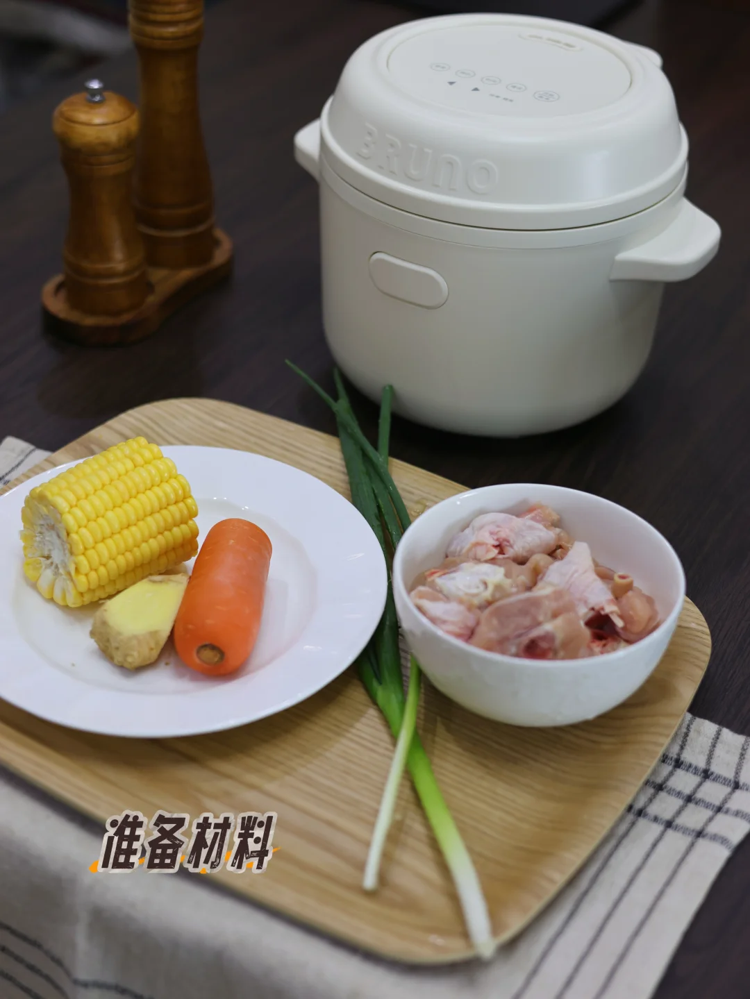鸡腿肉 250g(焯水去腥味)、甜玉米 1段(切小段)、胡萝卜 1段(切滚刀块)、生姜 3片、香葱 1根、料酒 1勺 + 盐 适量。