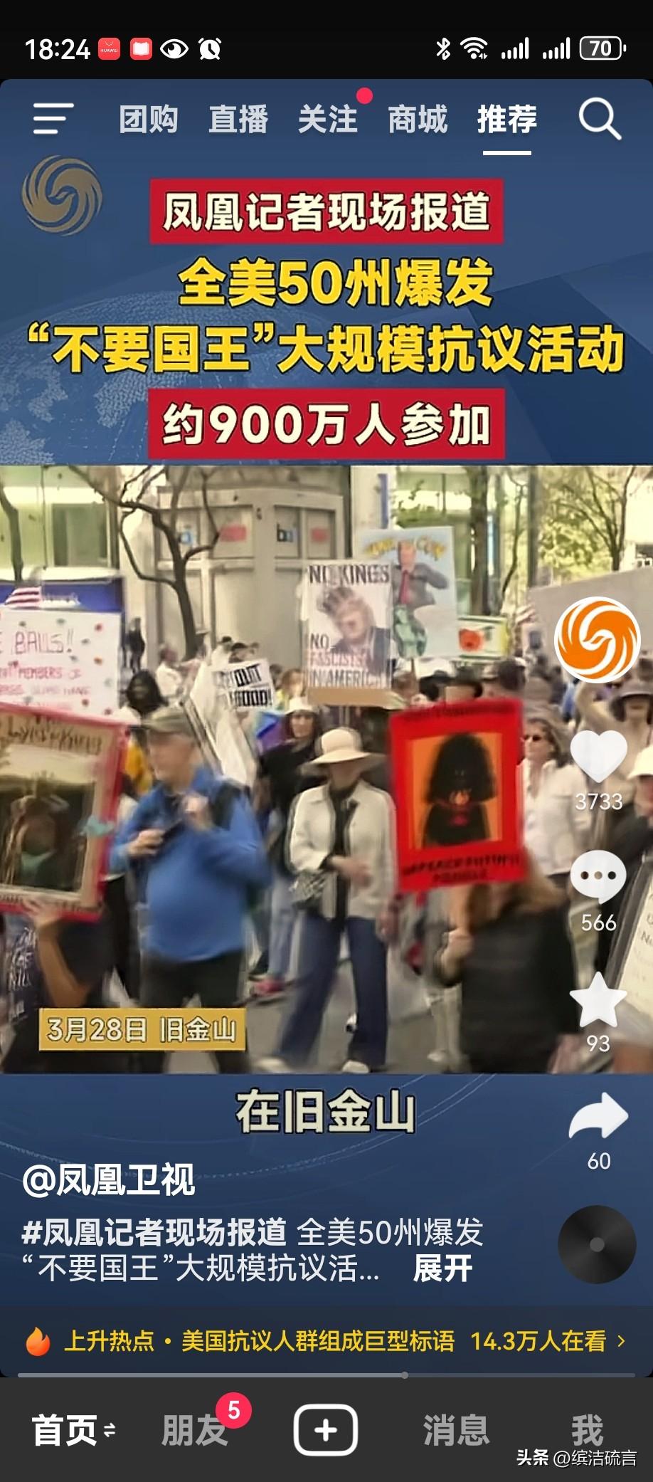 美国风景线又来了,这次特朗普如何应对?美国50州集体讨伐特朗普! 特朗普发动对伊朗战争后,战争局势越来越不可控,美国国内舆论压力很大,国民要求特朗普停止战争,不能做以色列的帮凶。 加上伊朗越打越猛,对美国威胁不是变小而是越来越大,也不知道伊朗还有多少底牌没有亮出来,如果伊朗真有核武器,那么美国可能就是一次非常冒险的行为。 美国50州集体讨伐特朗普 特朗普嘲讽英国航母你怎么看