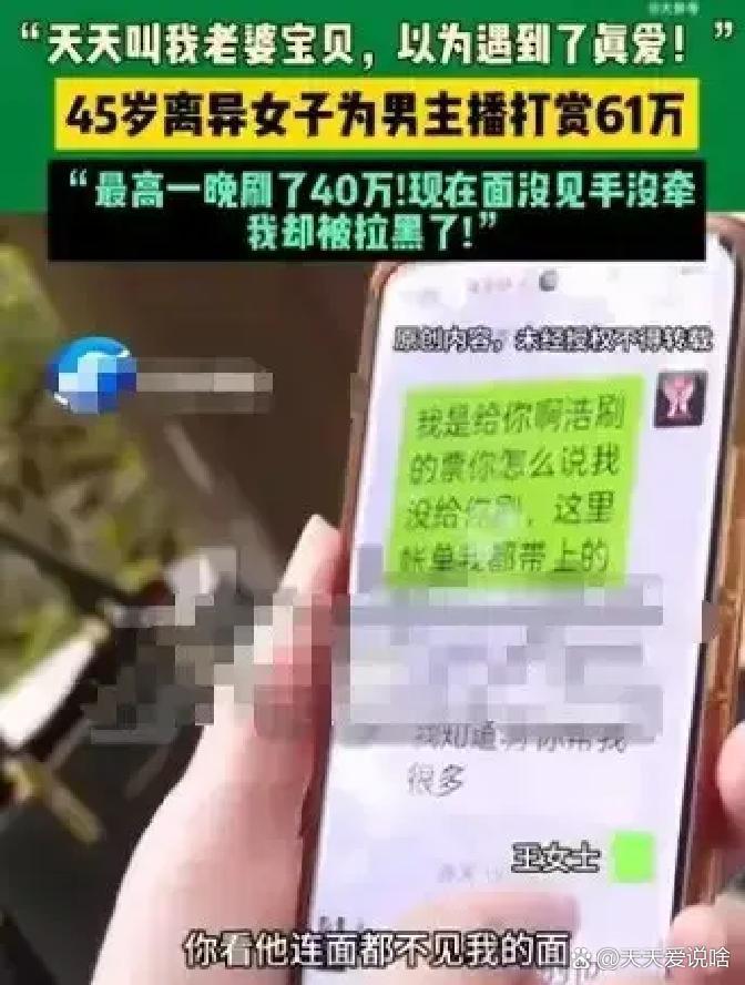 四川达州,有一王女士,今年45岁了,但已经离婚了,平时在一家单位工作。 可最近她突然迷上了一个男主播,对方天天喊她宝贝老婆,还经常关心她的生活,她很快就迷失了自我。 于是,她陆续打赏了61万元给这个主播,甚至连主播的堂哥也收到了11万加6000元的转账。 她做这些事,就是为了能见主播一面。 但是,她好几次提出要在线下见面,结果都被回绝了。 后来她干脆放下话说:“要是再不见面,我就停止打赏。 可没想到,第二天她的账号就被全平台拉黑了。 她一下子懵了,就连夜赶到郑州那家主播公司。 可推开门一看,办公的地方早就空荡荡的,一个人影都没有。 然后,她整理好了所有的转账记录,还有那些聊天截图,向警方报了案。 她怀疑自己遇到了那种骗感情的杀猪盘。 现在,要把钱追回来,可是很难。目前案子还在调查中。