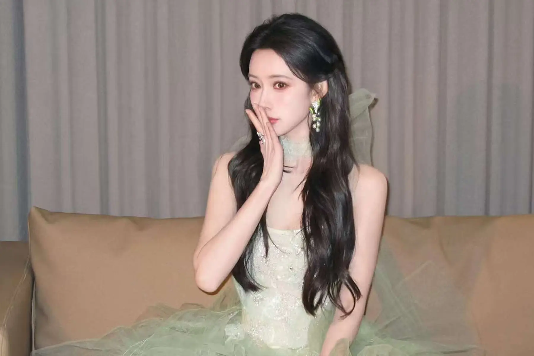孟子义穿薄荷绿抹胸裙温柔灵动 系大蝴蝶结可爱又仙气
