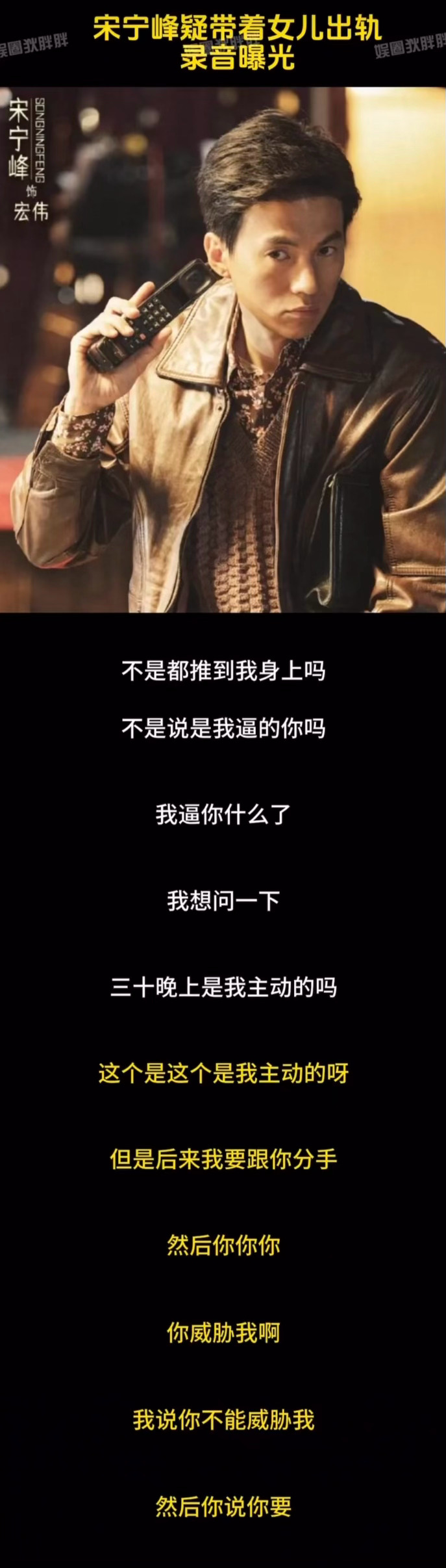 宋宁峰与出轨对象Q女士录音曝光。细节:1.宋宁峰带着女儿去出轨。2.宋宁峰:“确
