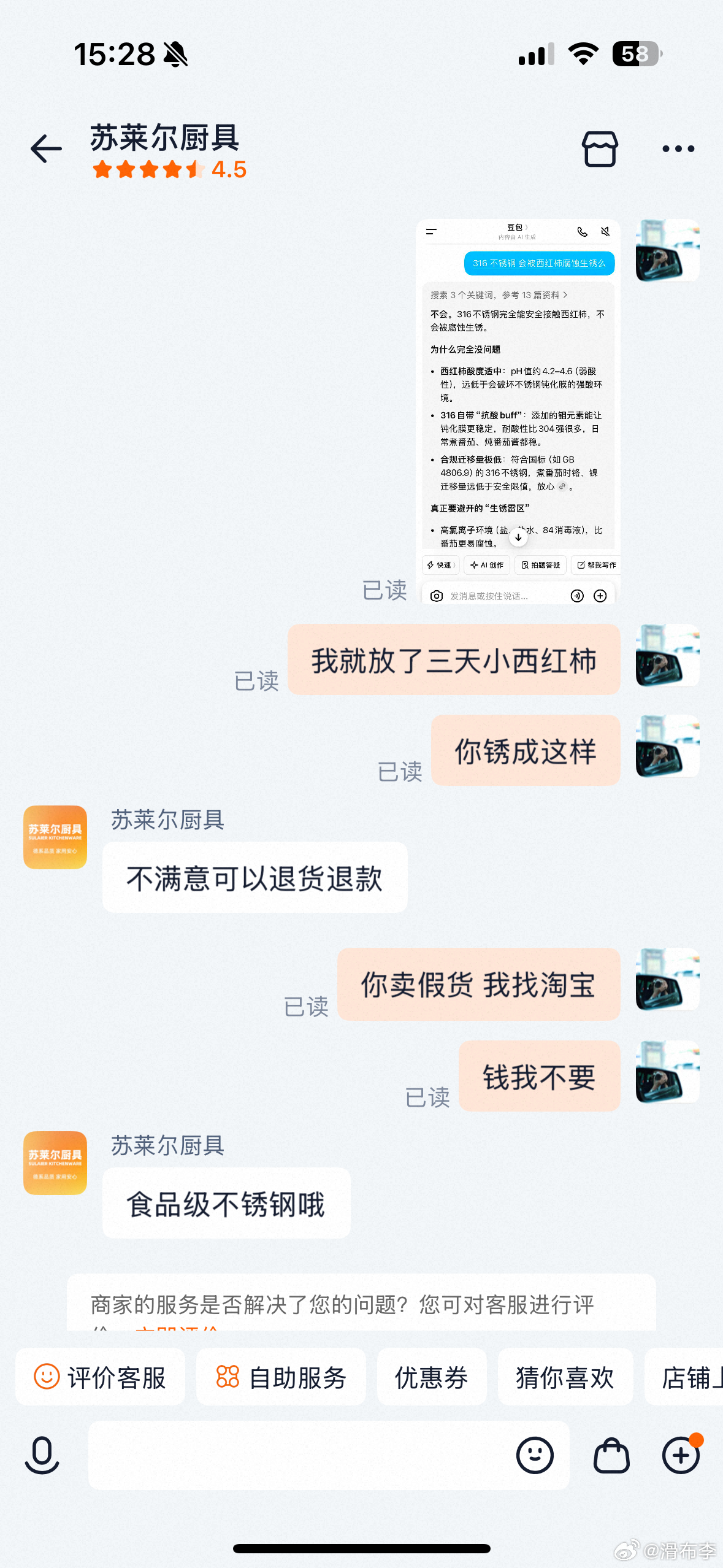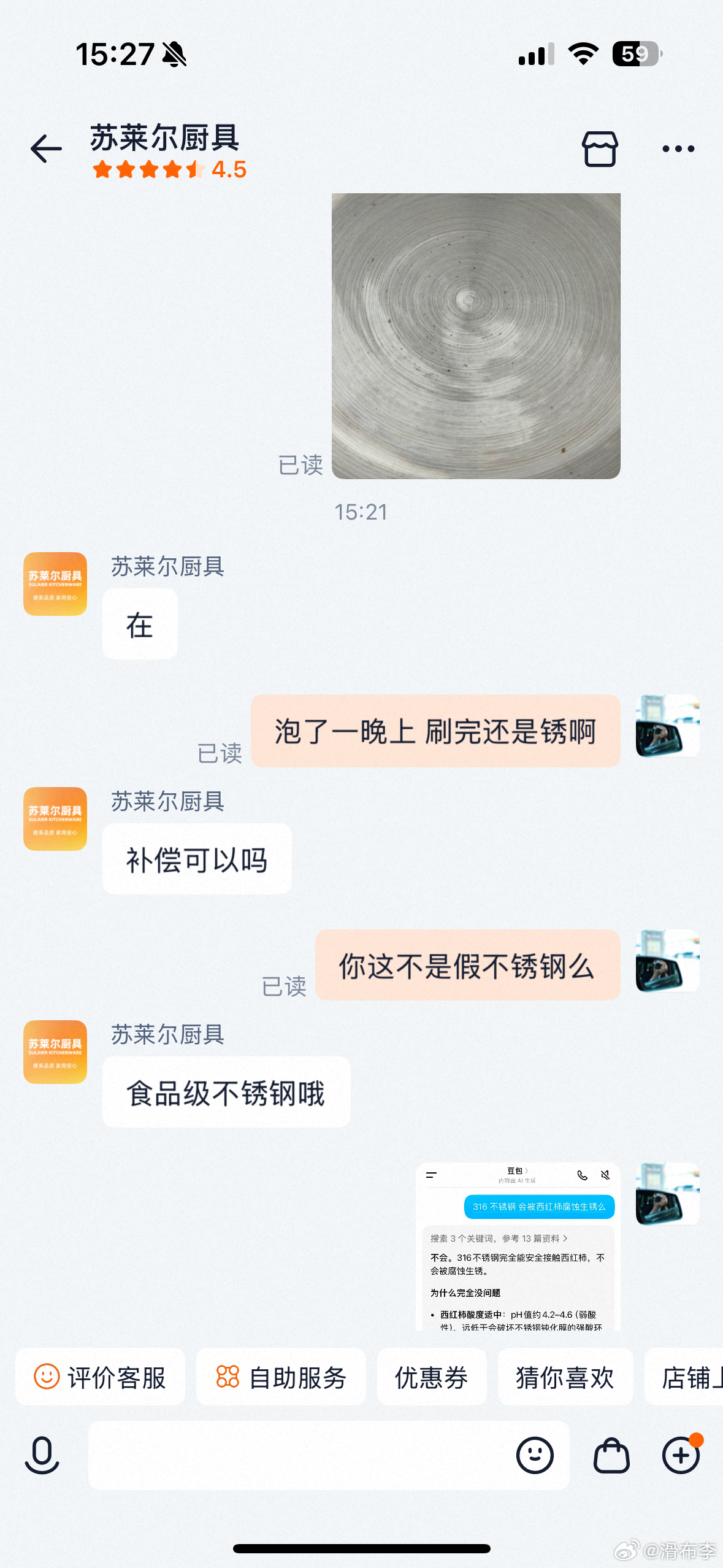 前几天买的不锈钢盆,它生锈了找商家,跟商家上演了一出各自的左右互搏不锈钢别高盐使