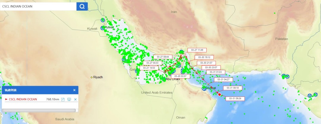 深圳报业集团记者查询船舶追踪数据系统得知,北京时间3月30日傍晚,“中海北冰洋”号与“中海印度洋”号从迪拜附近海域起锚,沿着伊朗最大岛屿格什姆岛与腊克岛之间的航线,以10.4节左右的航速,通过霍尔木兹海峡狭窄的出口,随后驶入阿曼湾水域。船舶追踪数据系统显示,这两艘船只预计4月6日抵达马来西亚的巴生港。