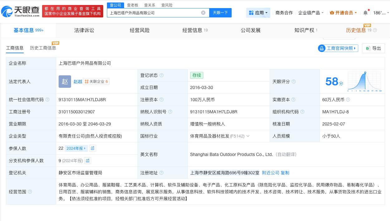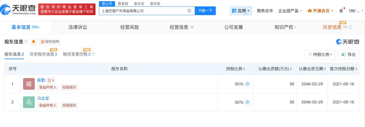 天眼查App显示,Patagonia关联公司上海巴塔户外用品有限公司成立于2016年3月,法定代表人为赵越,注册资本100万人民币,经营范围包括体育用品、服装鞋帽、日用百货的销售等。股东信息显示,该公司由喻勤、马志军各持股50%。值得一提的是,该公司曾因对商品作引人误解的虚假宣传、涉及专利的广告未标明专利号和专利种类,两次被上海市浦东新区市场监督管理局处罚,合计罚款4万元。