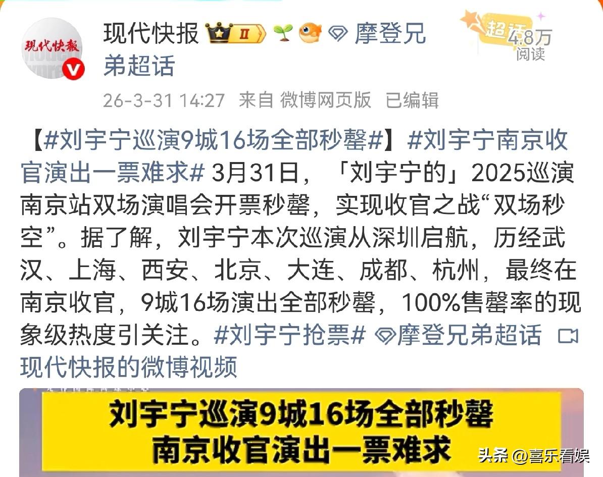3月31日,刘宇宁直接冲上热搜,原因是他的2025巡演南京收官场,开票直接秒罄,而且是双场全空。