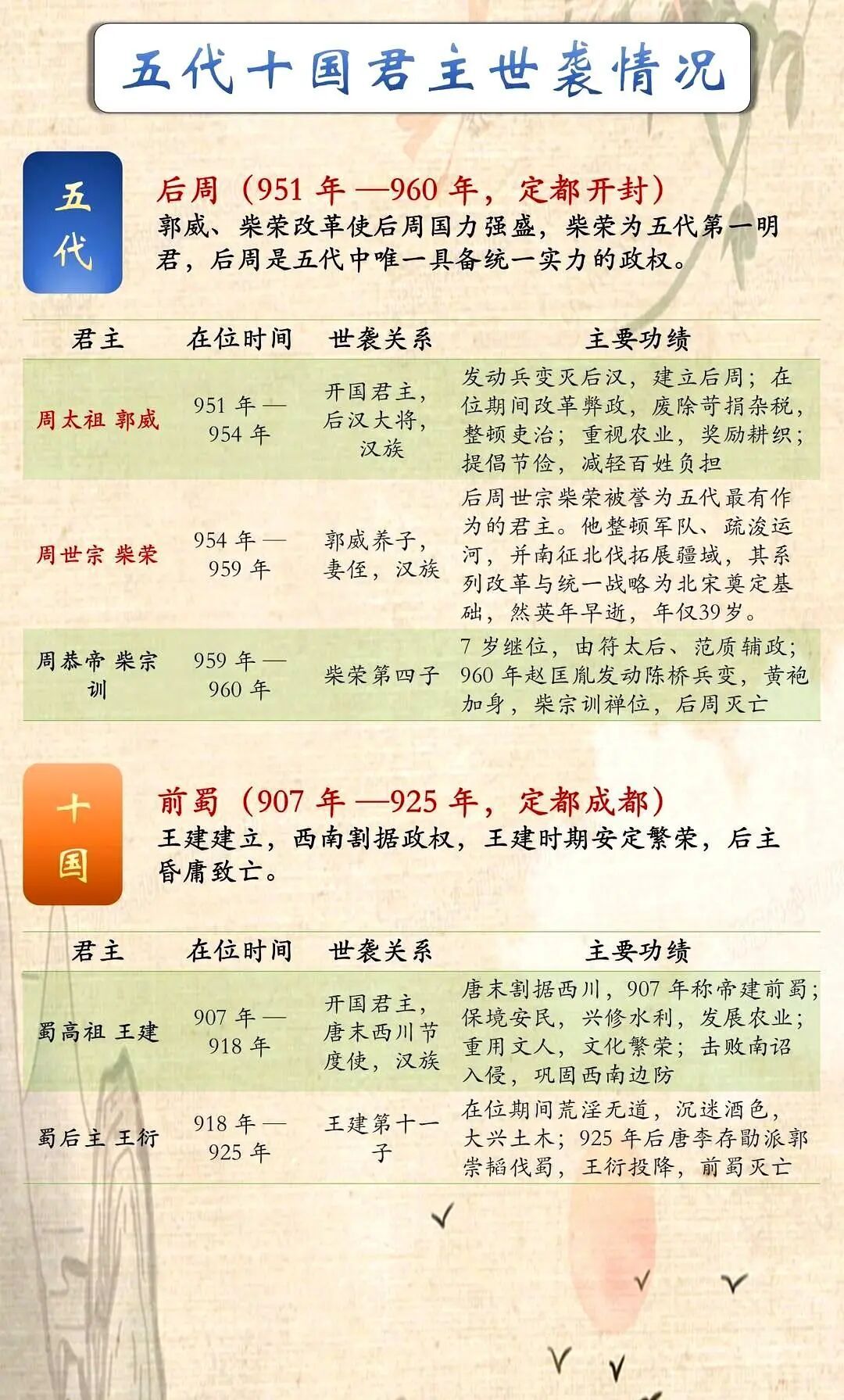 历史上,“五代十国”中的十国指前蜀、后蜀、南吴、南唐、吴越、闽国、南楚、南汉、荆南(南平)、北汉这十个割据政权。