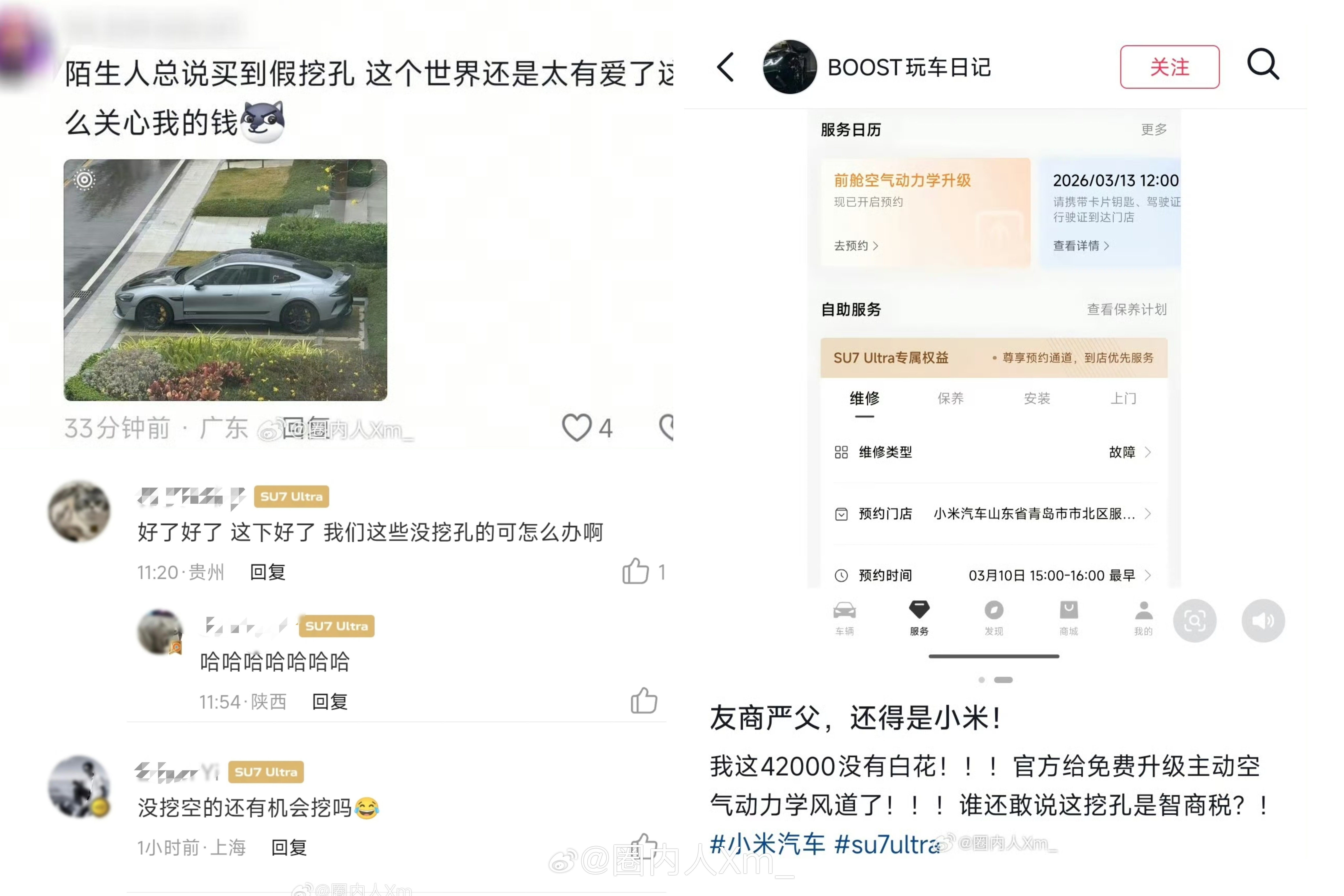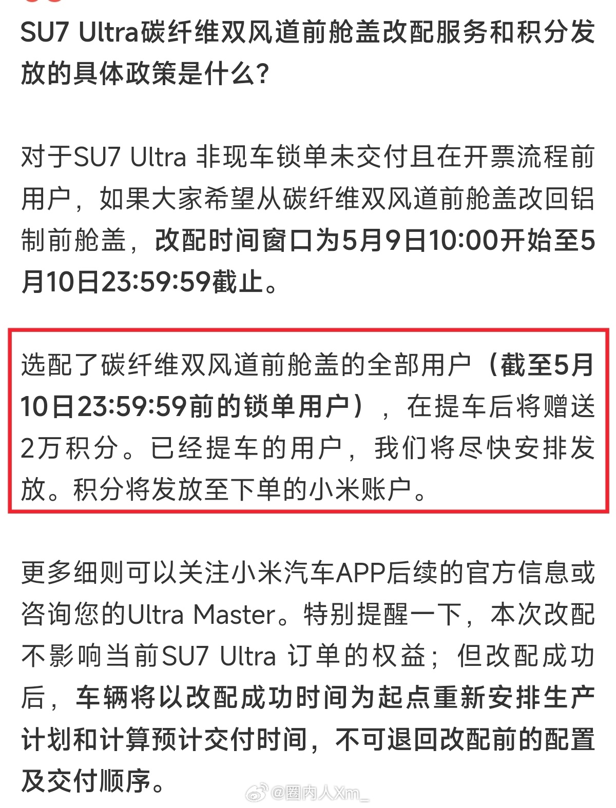 更讽刺的是,那些只顾冲热搜的媒体,连事件的完整处理过程都懒得交代。针对机盖争议,小米早已拿出了完整的折中解决方案:2025-05-07发布的内容(图5)不仅为用户提供 2 万积分补偿,开放了免费改选配的机会,后续还推出了开孔机盖的免费升级方案,全程没有回避问题、推诿责任。双方的分歧,仅仅是张雪认为更优的方案是直接退差价、无责退单,而小米出于合规与规则考量,给出了折中处理方式,这本是正常的诉求差异,却被媒体渲染成了 “小米拒不负责” 的负面剧本。