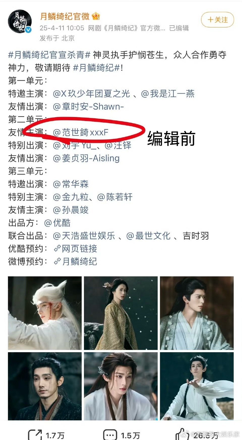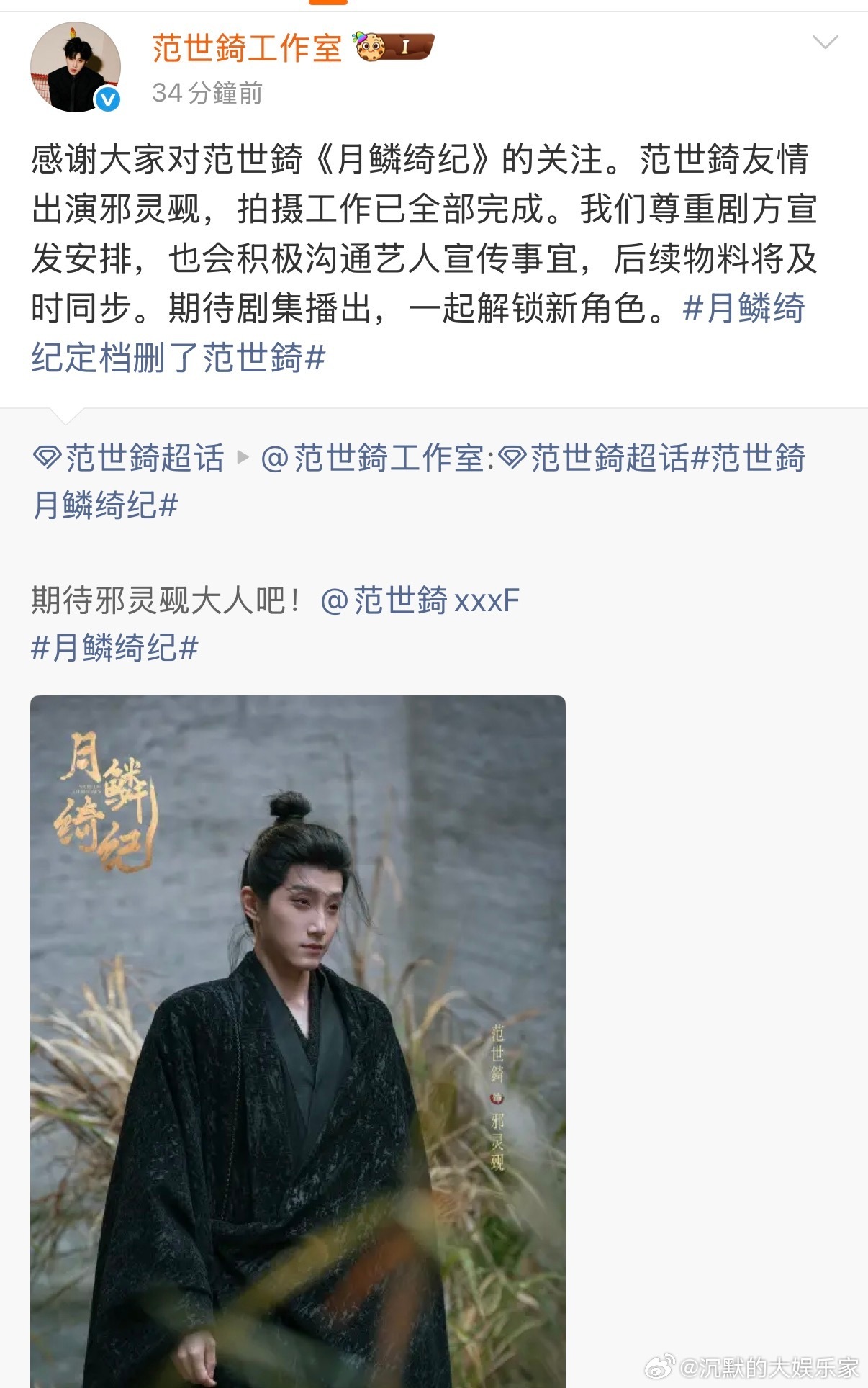 范世錡工作室回应《月鳞绮纪》定档删除范世錡,称尊重剧方宣发安排,也会积极沟通艺人