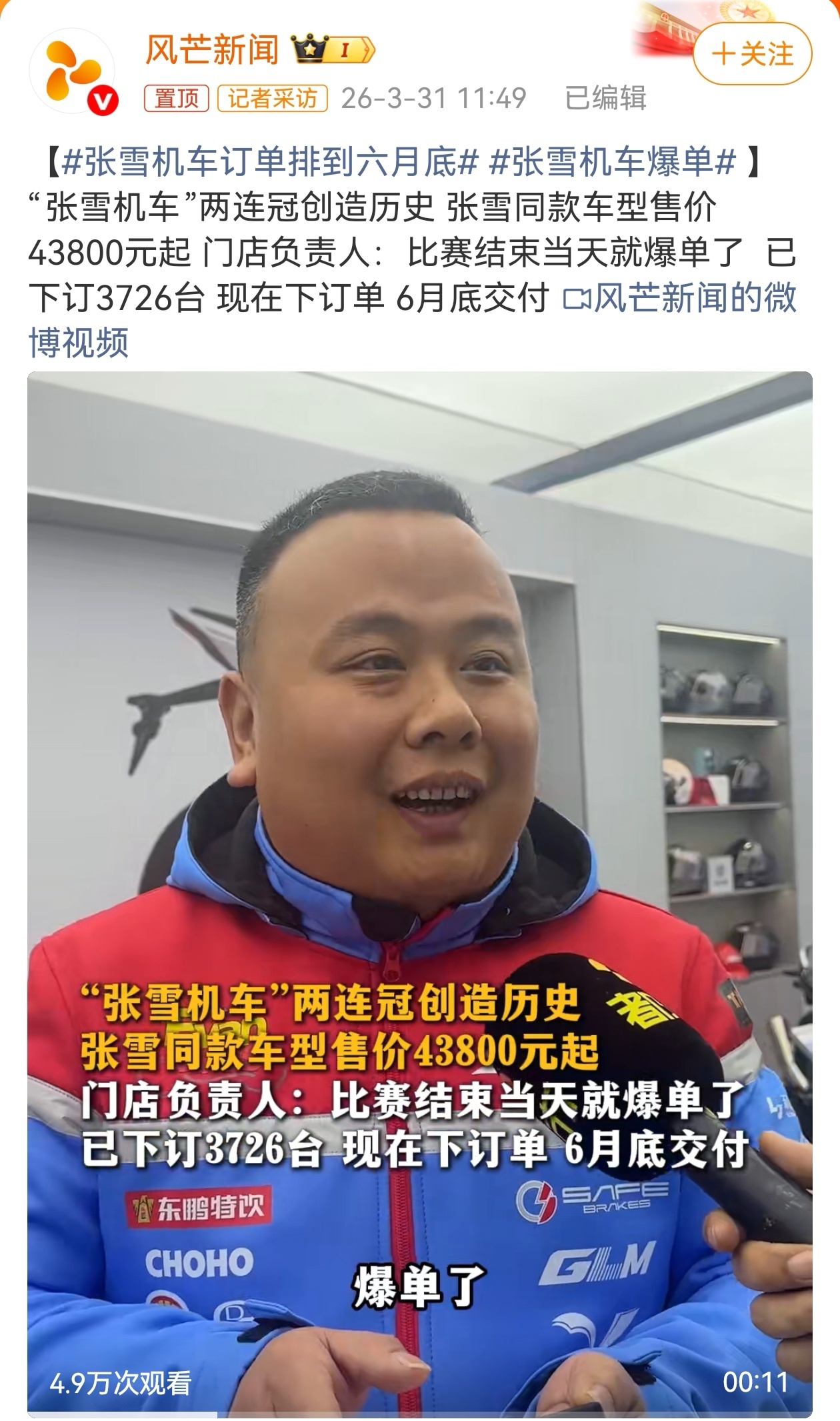 近日,张雪机车凭借超强实力,在世界超级摩托车锦标赛葡萄牙站SSP组别比赛中斩获两连冠,打破了国外品牌数十年的赛事垄断,让中国机车品牌闪亮世界赛场。伴随着赛事热度席卷全网,张雪机车迅速迎来市场爆单,现在下单需等到6月底才能交付。张雪机车订单排到六月底满谈品牌