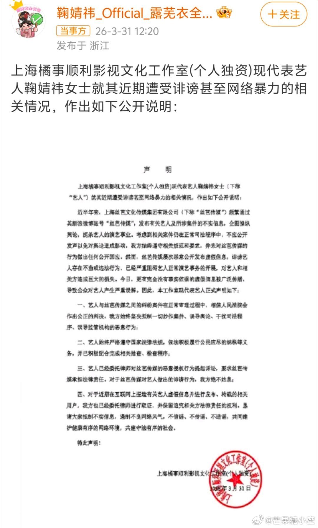 鞠婧祎工作室声明3月31日,鞠婧祎工作室发声明,全盘否认了前经纪公司丝芭传媒对她偷税漏税的实名举报。工作室称,丝芭近半年频繁散布不实信息,试图干扰司法审理、扼杀她的演艺事业,还强调这次举报完全没有事实依据。同时表示鞠婧祎一直依法纳税,配合过税务检查,已经启动法律维权程序。