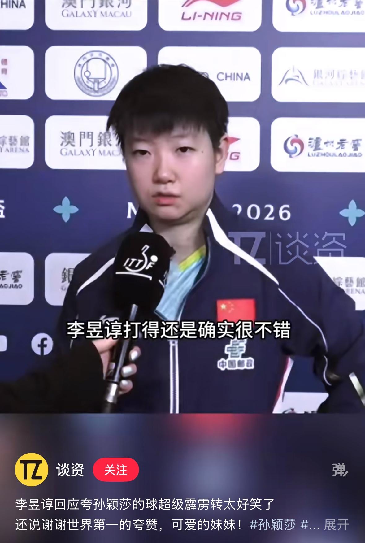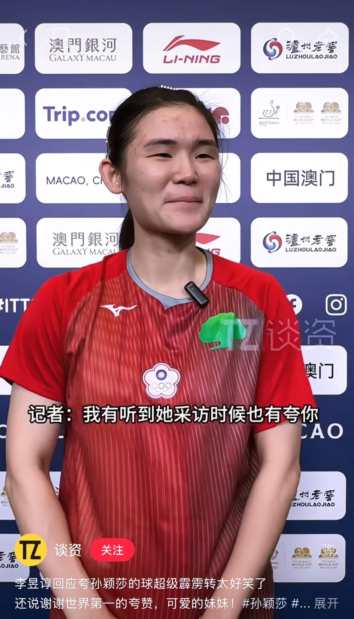 莎莎夸赞她,她很开心的回应! 超级霹雳转,又见识了一个不同的乒乓球选手,笑的很甜美! 感觉她真的是很小,台湾人,第一次和莎莎交手吧,这么多年都没有遇见过,李昱谆很乐观,但是还比莎莎大几岁! 台湾人很会说话,很显小的姑娘,面容很好,看起来就很开心,说话声音还很好听,很喜欢的一位!