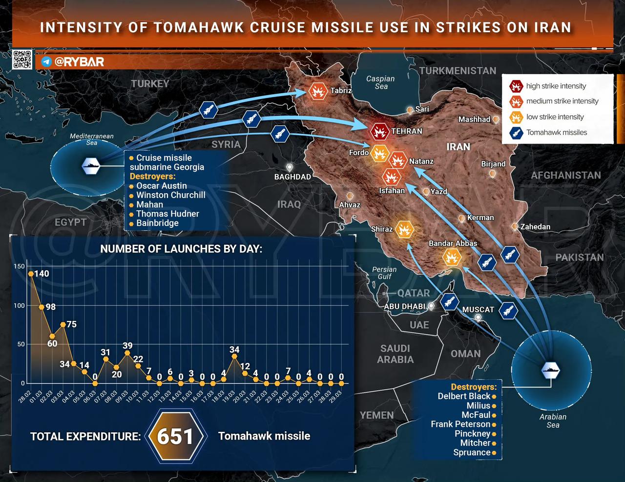 美以对伊朗的空袭架次惨不忍睹,一个月总共才2426架次,平均每天不到80架次。实际上,空袭最多的一天是202架次,最少的一天只有16架次。对一个中等偏上的地区强国进行空袭,每天这么一点儿空袭架次,太差了。 舰载/潜射“战斧”巡航导弹在一个月总共发射了651枚,且有11天的单日发射数量为零。而美军的“战斧”导弹库存总量也才3000多枚,这就意味着战争持续,美军“战斧”导弹的使用量依然会非常少,担心把库存打得见底的话,那就别想在东大面前咋咋呼呼了。