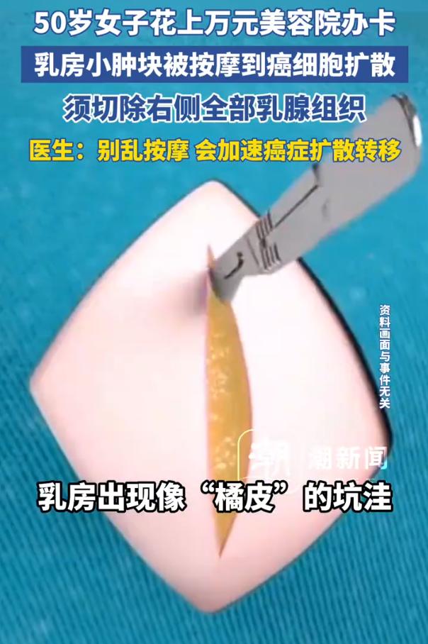 浙江,50岁女子在家里洗澡时,突然摸到乳房处有个硬块,一次按摩时偶然提及此事,技师表示可以用精油按摩消肿,女子听信后花万元办了卡,结果钱花了,几个月后病情也跟着严重了,就医后被确诊为乳腺癌并已发生淋巴结转移。医生:来的太晚了 张女士是一家企业的主管,平时工作很忙,次洗澡时无意摸到右边乳房里有个花生米大小的硬块。不疼不痒,她也没太当回事,想着改天抽空去医院看看 后来她去美容院做肩颈按摩,随口跟技师提了一嘴。技师一听,立刻来了精神,说这是肝气郁结、经络不通,用精油按摩就能把结节揉散,把毒素排出来 张女士一听不用动刀,就相信了对方的专业,花一万多办了张胸部疏通理疗卡。接下来的三个月,她每周准时去报到,接受大力推拿、揉搓、热敷 结果呢?小肿块没散,反而长到了红枣大小,摸起来硬得像石头。右胸开始胀痛,皮肤变得像橘子皮一样坑坑洼洼。更糟的是,腋窝下也摸到了几个硬疙瘩 到医院一查:右侧乳腺浸润性癌,已经发生腋窝淋巴结转移 医生说,刚发现花生米大小的硬块时,很可能还是早期乳腺癌。但几个月的挤压按摩,很大程度上加速了癌细胞的扩散。肿瘤太大,又转移了,常规保乳手术做不了,只能切除全部右侧乳腺 这件事让人心里很不是滋味 张女士不是没警惕性。她摸到硬块后,原本打算去医院。错就错在,她把一个需要严肃对待的身体信号,交给了没有医学资质的美容院 这里有一个很多人没意识到的陷阱:早期的乳腺癌肿块,往往不疼不痒。恰恰因为不难受,人才容易放松警惕,觉得不是什么大事,试试按摩也无妨。而美容院技师那套肝气郁结、经络不通的说法,正好给这种侥幸心理找了个听起来合理的解释 我觉得,按摩没问题,但美容院那些胸部疏通、排毒、散结的项目,可以这么理解:如果真有用,医院早就引进了。医院不用的东西,不是因为不想用,是因为没用,甚至有害。