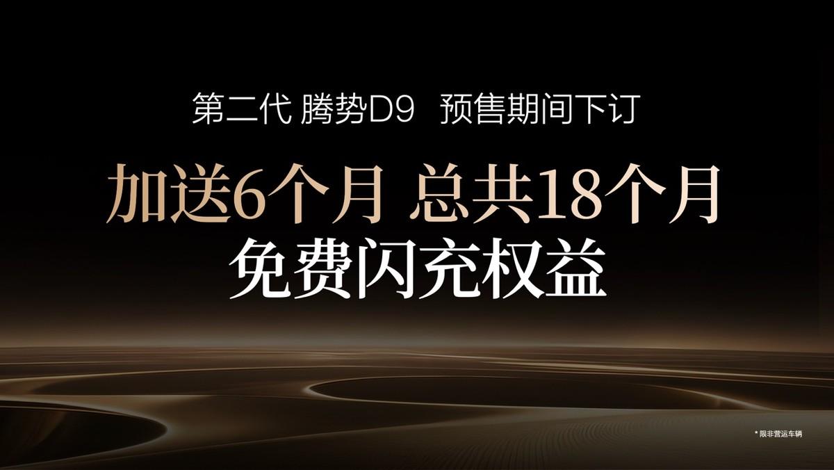 3月29日,备受关注的科技豪华旗舰MPV——第二代腾势D9开启预售,集比亚迪第二代刀片电池、天神之眼 5.0等前瞻科技于一身,在电动、智能、豪华设计等方面全维进化,重塑豪华MPV价值新标杆,堪称时代旗舰,大成之作!第二代腾势D9预售价格区间为38.98万-48.98万。 第二代腾势D9传承“优雅之势”经典设计,气度恢宏,于商务接待与家庭出行中,尽显非凡品位。全新前脸以“展翼腾飞”为核心意象,矩阵式高亮金属羽翼层层铺展,勾勒出乘风而起的姿态,传递出一往无前的精神,尽显豪华风范。 步入车内,新车内饰采用全新的设计语言,以百万级的豪华标准,将豪华体验提升至全新维度。标配怀挡重塑前排奢阔格局。NAPPA真皮座椅搭配精致绗缝工艺,触感细腻,共同营造出旗舰级的尊崇氛围。 乘坐体验上,新车中排升级零压云绒座椅,独创的丝柔悬浮层带来极致的柔软度、包裹性和乘坐舒适感,配合按摩、电动调节等功能,带来头等舱级舒适享受。 副驾配备的开合智能屏,满足多场景娱乐需求:平时可以放歌、刷短视频;想要观影时,翻下大屏,尽享沉浸式观影体验。贴心的是,翻下来的小桌板还可放置太阳镜、耳机等随身物件,细节处见豪华。 搭载第二代刀片电池,纵享无界。第二代腾势D9搭载比亚迪第二代刀片电池,续航全面突破:插混车型纯电续航达401km,远超同级,无论是日常代步,还是短途商务,皆可全程纯电,无需费油;纯电车型续航高达800km,跨城商务会议、全家出游不焦虑。同时,新车还实现了“5分钟充好,9分钟充饱,零下30℃只多3分钟”的颠覆性闪充体验,买杯咖啡的时间即可满电,搭配遍布全国的闪充站,让长途出行告别里程焦虑。第二代腾势D9的长续航+闪充,才是新能源豪华MPV的黄金组合,实现充电自由 + 时间自由 + 出行自由,让用户真正零焦虑。 标配天神之眼5.0,从容驾控。智能化方面,新车发布即全系搭载天神之眼5.0,采用行业领先的全闭环端到端架构,并具备强化学习能力,依托海量真实驾驶数据持续进化,比老司机开得更稳、停得更准、反应更快,让每一程都安心无忧。