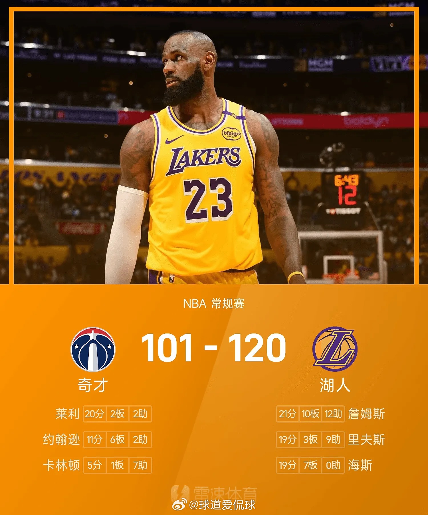 詹姆斯砍下全场最高的21分10板12助,率领湖人成功取胜。