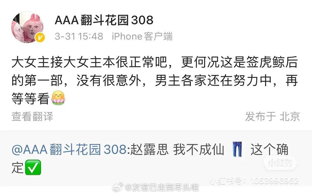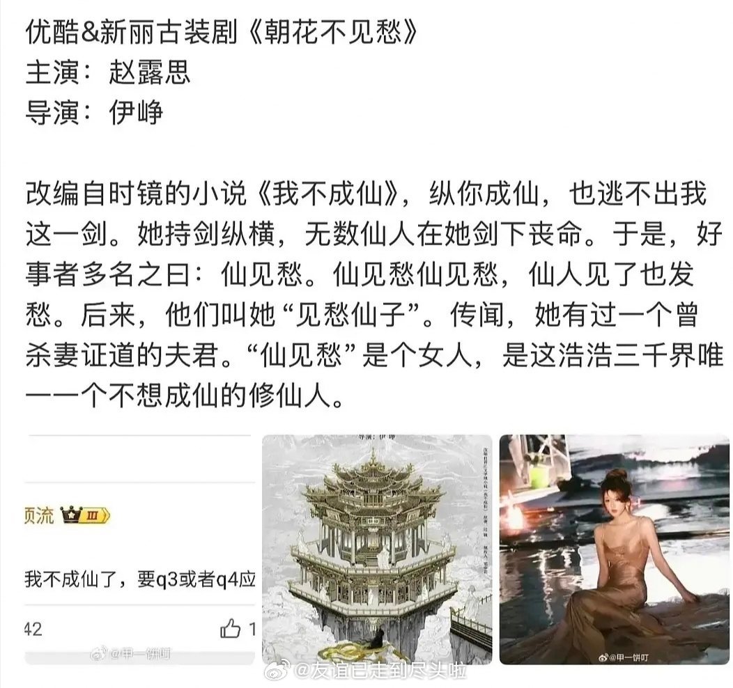 我不成仙 赵露思《我不成仙》,新丽大女主仙侠剧。顶流扛剧花+苍兰诀导演,男主抢破头,各家还在努力中。