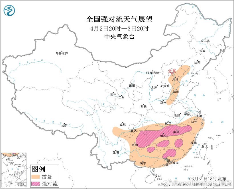 预计4月2日20时至3日20时,湖南、江西、浙江西南部、福建西部、贵州中东部、广西东北部、广东中北部等地的部分地区将有强对流天气。