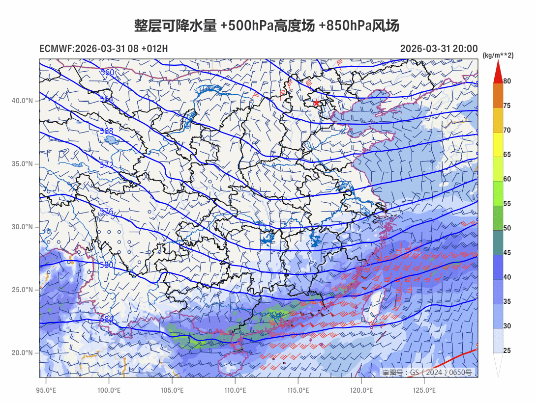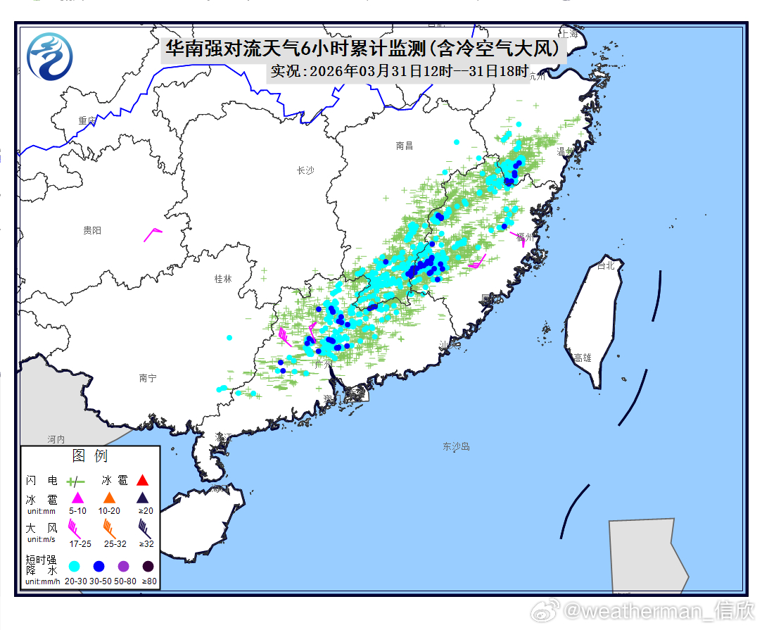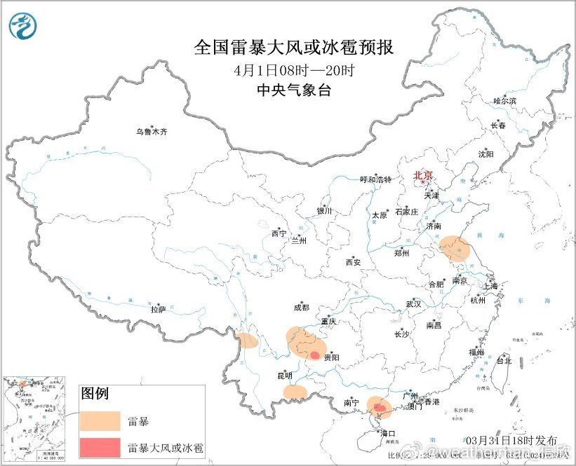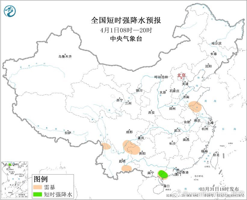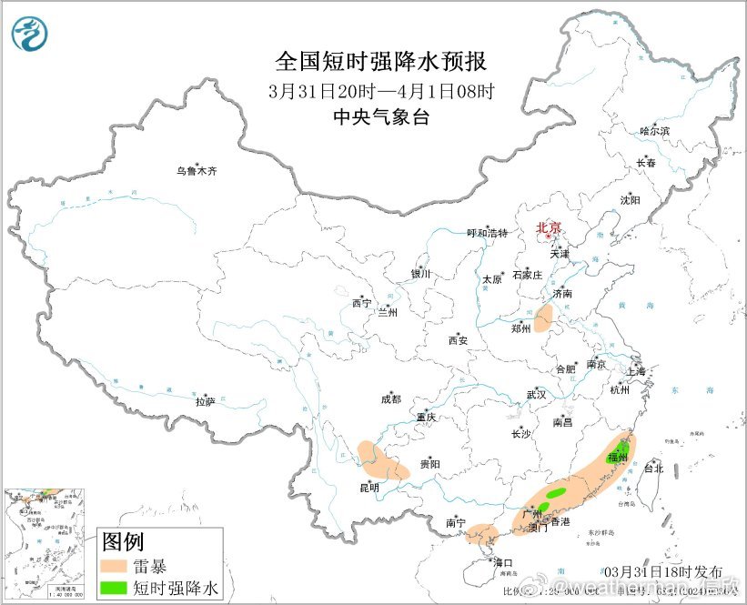 预计3月31日20时至4月1日20时,福建东部、广西东南部、广东中部和西南部等地的部分地区将有短时强降水天气,小时雨量20-40毫米,局地可达50毫米以上;另外,福建东部、贵州西南部、广东中部和西南部等地局地将有雷暴大风或冰雹天气。