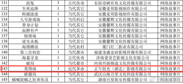 正午阳光申报了网络故事片《莫得闲》备案,题材是3集的近代革命剧,是不是电影《得闲