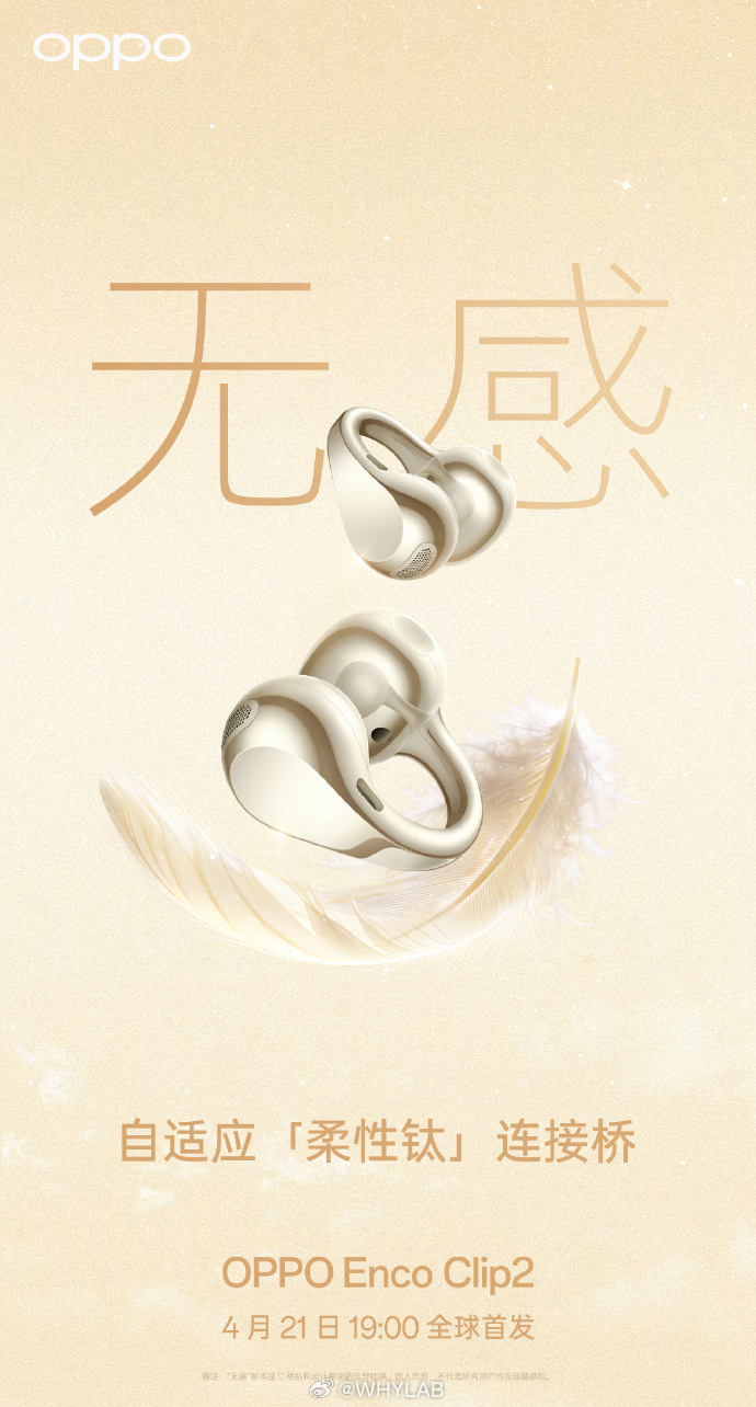 除了两款手机,关注度最高的就是 OPPO Enco Clip2 耳夹耳机了,单耳重量 5.2 克,通过德国莱茵 TÜV 佩戴无忧认证,采用自适应柔性钛连接桥,售价和上代应该差不多。