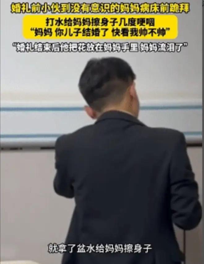 泪目了!河南开封,新人婚礼结束,晚上本该同房的时候,新郎却把新娘拉到了医院,跪在病床前,朝床上的病人恭恭敬敬拜了三拜,原来,躺在病床上的正是新郎的母亲,而母亲却没有了意识。 张松林打小就和母亲相依为命,父亲走得早,家里的重担全压在母亲一个人身上。母亲没什么文化,靠打零工、摆小摊把他拉扯大,这辈子最大的心愿,就是看着他成家立业,娶个好媳妇。 一年前,母亲突发脑干出血,送进医院抢救后,就再也没醒过来。医生下了好几次病危通知,说能保住命已经是奇迹,醒过来的希望微乎其微。 张松林没放弃,砸锅卖铁给母亲治病,每天守在病床前,给母亲擦身、按摩、说话,盼着哪天母亲能睁开眼,再叫他一声儿子。这一年多,张松林几乎没睡过一个整觉,每天凌晨起来给母亲翻身、拍背,怕母亲长褥疮。白天要去打工赚钱,赚的钱全用来给母亲交医药费,自己舍不得吃舍不得穿,一件衣服穿了好几年。 张松林和女友李娟谈了好几年,感情一直很好。原本打算等攒够了钱,给母亲换个好点的病房,再办婚礼。 可母亲的病情一天比一天重,医生说,老人撑不了多久了。张松林急了,他怕母亲带着遗憾走,更怕辜负陪自己熬了这么多年的女友。他和李娟商量,提前办婚礼,让母亲亲眼看着自己成家。 李娟想都没想就答应了,她知道婆婆的心愿,也懂张松林的难处,甚至主动提出,把原本准备办豪华婚礼的钱,拿出来给婆婆治病,只办一场简单的仪式就行。 婚礼当天,张松林心里一直惦记着病床上的母亲。仪式开始前,他特意提前赶到医院,推开病房门,就蹲在母亲床边,一遍一遍跟母亲说话。 他说,妈,今天你儿子结婚了,快看看我帅不帅。说着说着,声音就哽咽了,眼泪止不住往下掉。他怕母亲躺着不舒服,打了盆温水,给母亲擦脸、擦手,动作轻得怕碰疼了母亲。他跟母亲讲,自己娶的媳妇有多好,以后会好好过日子,让母亲放心。 婚礼仪式一结束,张松林没顾得上和亲友敬酒,没顾得上回新房,拉着李娟的手就往医院赶。 他要让母亲亲眼看到自己的媳妇,要给母亲磕三个头,报答养育之恩。推开病房门,呼吸机的滴答声格外清晰,母亲还是那样安静地躺着,毫无意识。张松林拉着李娟,咚的一声跪在病床前,恭恭敬敬磕了三个头。李娟没有半点怨言,跟着丈夫一起跪了下去,对着病床深深鞠躬。她早就把婆婆当成了自己的亲人,哪怕婆婆醒不过来,她也要给婆婆行个礼,认下这个婆婆。 拜完之后,张松林趴在母亲耳边,把婚礼上的手捧花轻轻放在母亲手里。他跟母亲说,妈,这是你儿媳妇的花,你拿着,就当你也参加了我们的婚礼。 就在这时,让人泪目的一幕发生了,母亲的眼角,缓缓流出了一滴眼泪。在场的护士都惊呆了,她们说,老人昏迷这么久,从来没有过这样的反应,这是母亲听到了儿子的话,感受到了儿子的幸福。 张松林说,自己这辈子,最亏欠的就是母亲和女友。母亲为了他,吃了一辈子苦,没享过一天福。女友为了他,陪自己熬了这么多年,在最难的时候也没离开。 他办这场婚礼,就是为了完成母亲的心愿,给女友一个交代。他说,不管母亲能不能醒过来,他都会一直守着母亲,给母亲养老送终,也会好好疼自己的媳妇,把日子过好,不辜负两个人的付出。 这件事传开之后,无数网友被感动了。有人说,这才是真正的孝心,不是做给别人看的,是刻在骨子里的。有人说,新娘也是个好姑娘,能理解丈夫,陪着丈夫一起尽孝,这样的婚姻才长久。也有人说,母亲的那滴眼泪,是世界上最珍贵的眼泪,是母亲对儿子最深的爱。 很多人说,现在的年轻人,结婚只想着自己的浪漫,很少有人会把父母的心愿放在第一位。张松林的举动,给所有人上了一课。孝心从来不是嘴上说说,是在人生最重要的时刻,心里还装着生养自己的母亲,是哪怕母亲毫无意识,也要给她一个交代,让她没有遗憾。 李娟的懂事,也让无数人称赞。她没有因为丈夫把自己拉去医院而生气,反而全程支持,陪着丈夫尽孝。好的婚姻,从来不是互相索取,是互相理解,互相扶持,一起承担生活的风雨。张松林有孝心,李娟有善心,两个人的结合,才是真正的良配。 母亲的那滴眼泪,不是奇迹,是母爱的本能。哪怕身体失去了意识,母亲的心里,永远装着自己的孩子。孩子成家的喜悦,孩子的孝心,母亲都能感受到。这就是母爱,伟大又深沉,哪怕隔着生死,也能传递温暖。 各位读者你们怎么看?欢迎在评论区讨论。