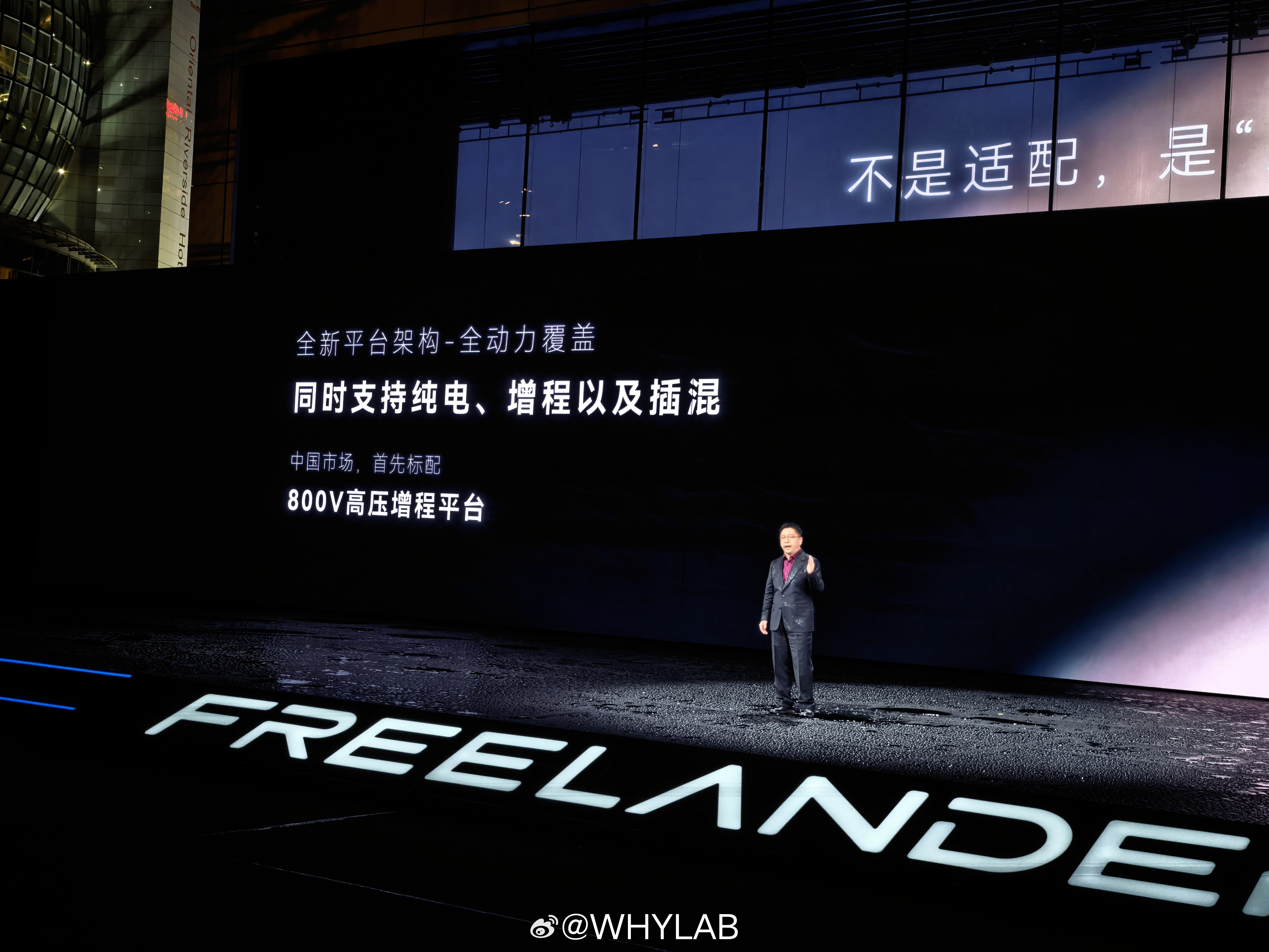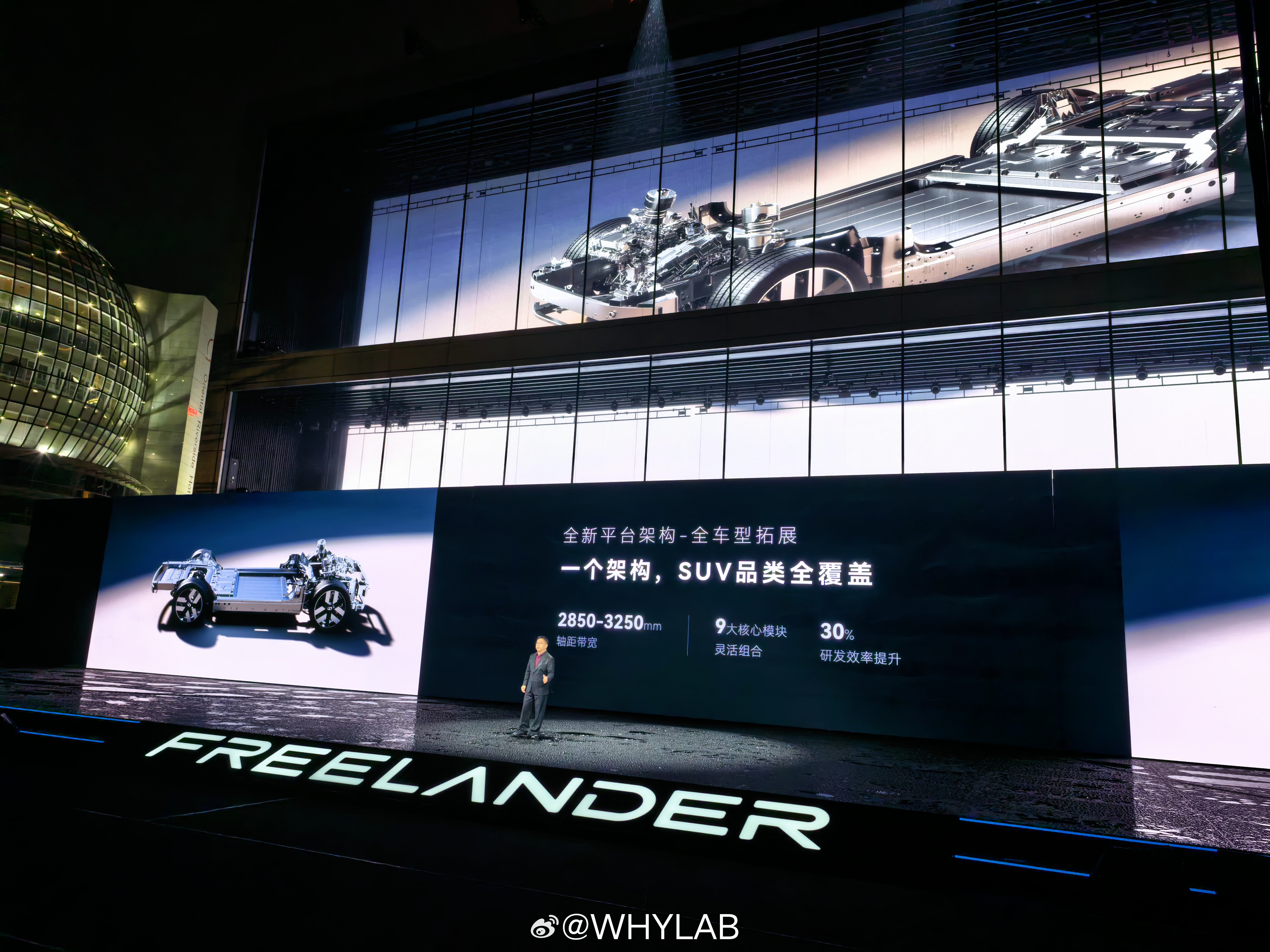 FREELANDER 神行者将采用全新平台架构,搭载 AI 超算平台,中央超算+域控融合架构,响应时间缩短约 50%,2850-3250mm 轴距带宽全车型拓展,标配 800V 高压平台,同时支持纯电、增程、插混三种动力形式。
