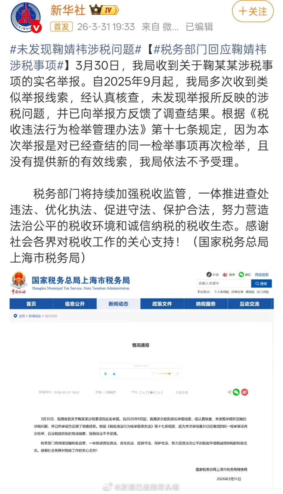 未发现鞠婧祎涉税问题 税务局发声明了,经调查未发现鞠婧祎有相关涉税问题鞠婧祎现在就像爽文大女主,啪啪打丝芭的脸,看丝芭吃瘪好爽 丝芭三问鞠婧祎 鞠婧祎方否认偷税漏税