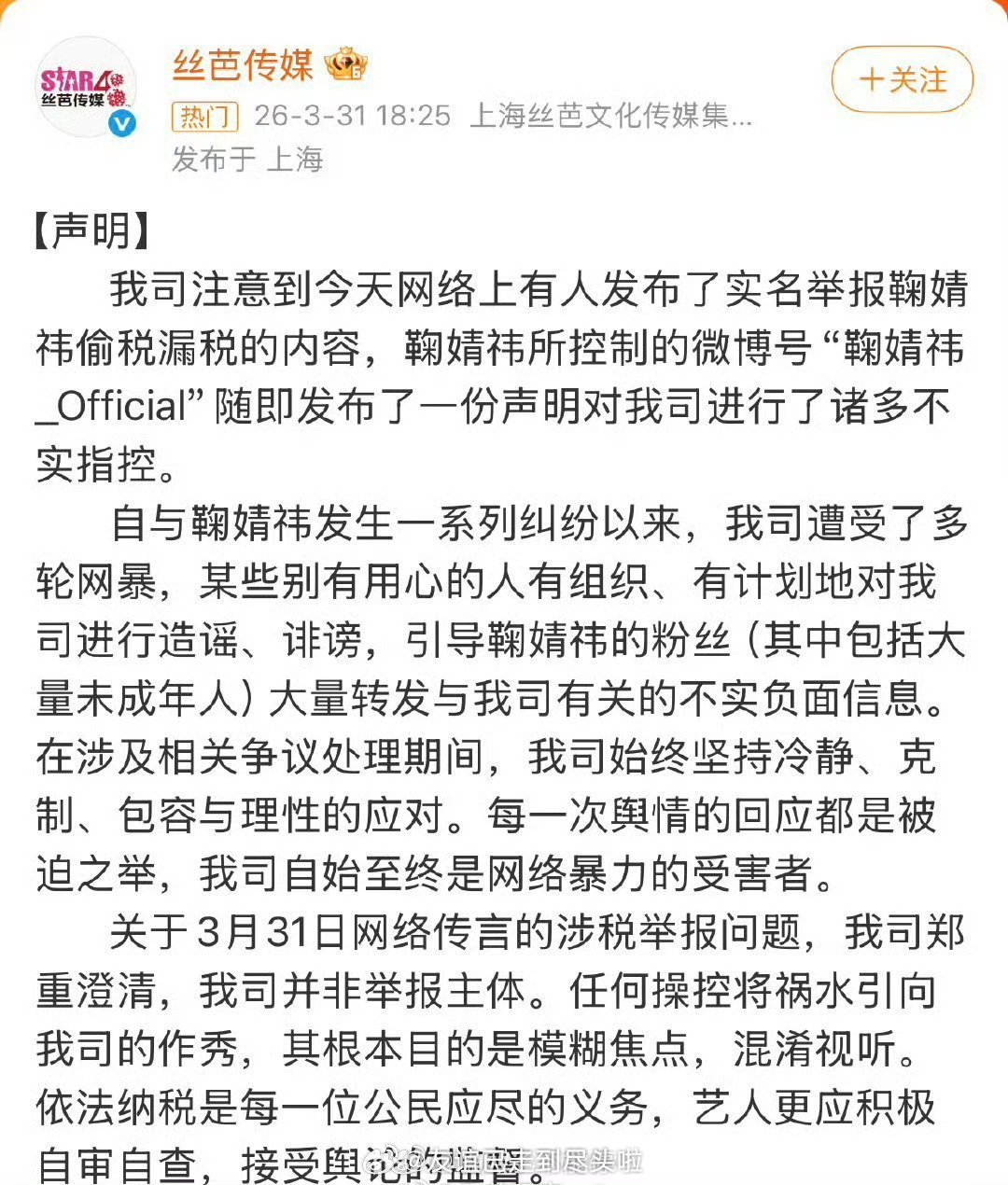 丝芭发声明说不是举报鞠婧祎偷税漏税的主体,意思是鞠婧祎为了网暴丝芭在作秀丝芭,你听听,这话合理吗? 丝芭三问鞠婧祎 未发现鞠婧祎涉税问题
