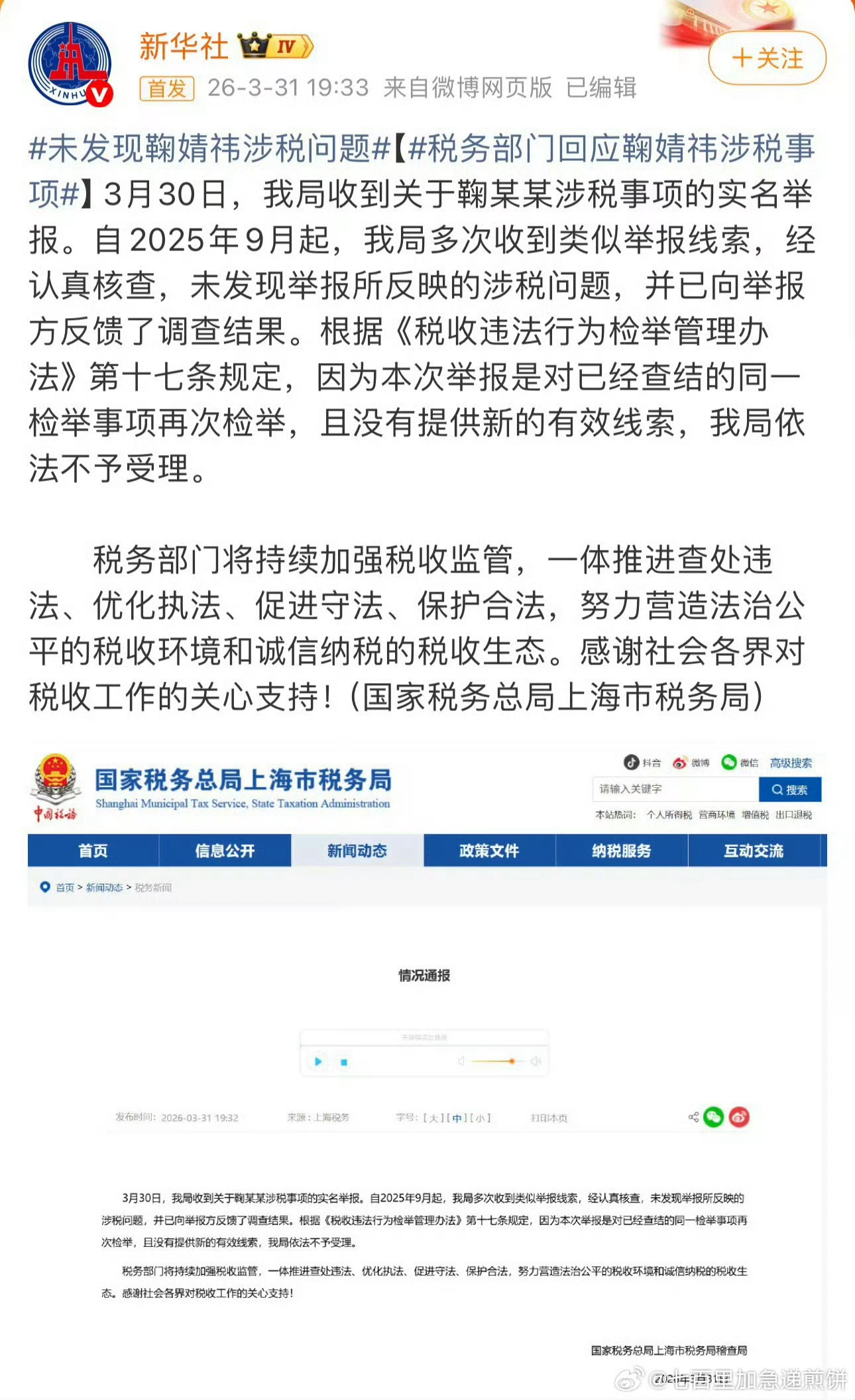 wok!!!税务部门回应鞠婧祎被举报:未发现举报所反映的涉税问题未发现鞠婧祎涉税问题|税务部门回应鞠婧祎涉税事项