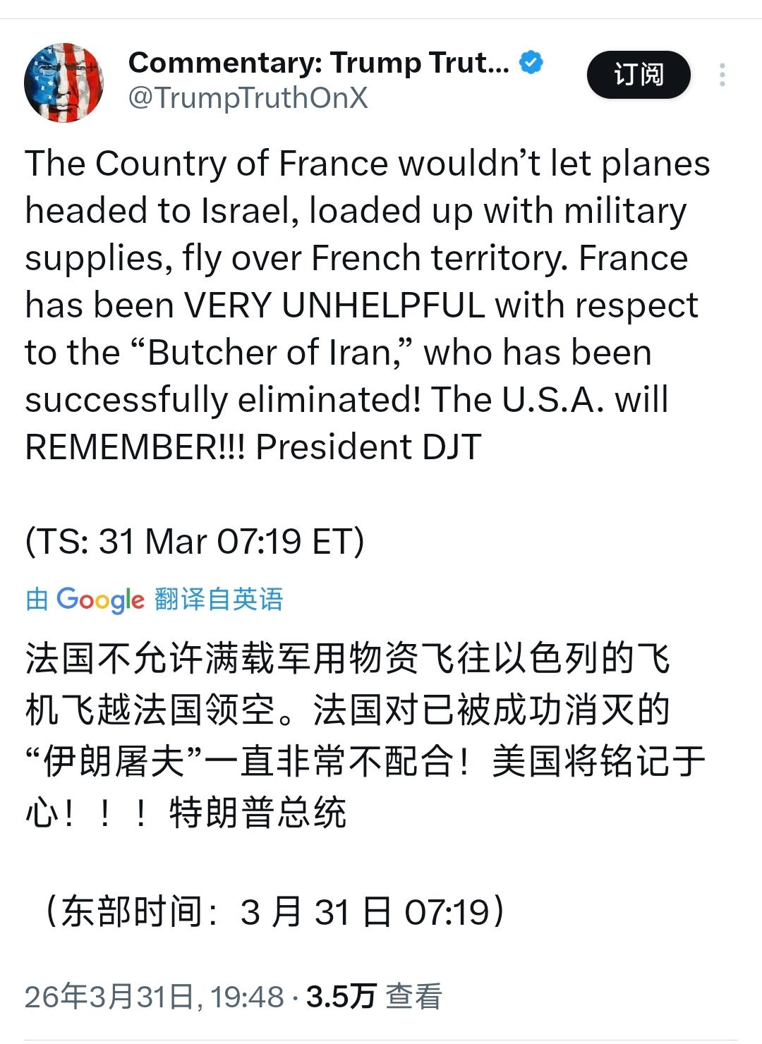 骂完英国之后,特朗普继续针对法国:“法国不允许满载军用物资飞往以色列的飞机飞越法国领空。法国在‘伊朗屠夫’一事上非常不配合,不过他已经成功被铲除!美国将铭记于心!!!” [机智]评几句:特朗普气急败坏骂完英国又炮轰法国,通篇胡说八道语无伦次,对盟友的傲慢与不尊重尽显无遗。法国拒绝为美以军事冒险开绿灯,本是坚守主权与和平立场,却被其无端指责“不配合”,还满口谎言吹嘘铲除所谓“伊朗屠夫”,无视伊朗仍掌控局势的现实。特朗普动辄以“铭记于心”要挟盟友,将欧洲伙伴的自主选择视作冒犯,把同盟关系当作唯美国马首是瞻的依附关系。如此蛮横的霸权做派,暴露了特朗普外强中干,也只会让更多盟友看清美国的自私本质。